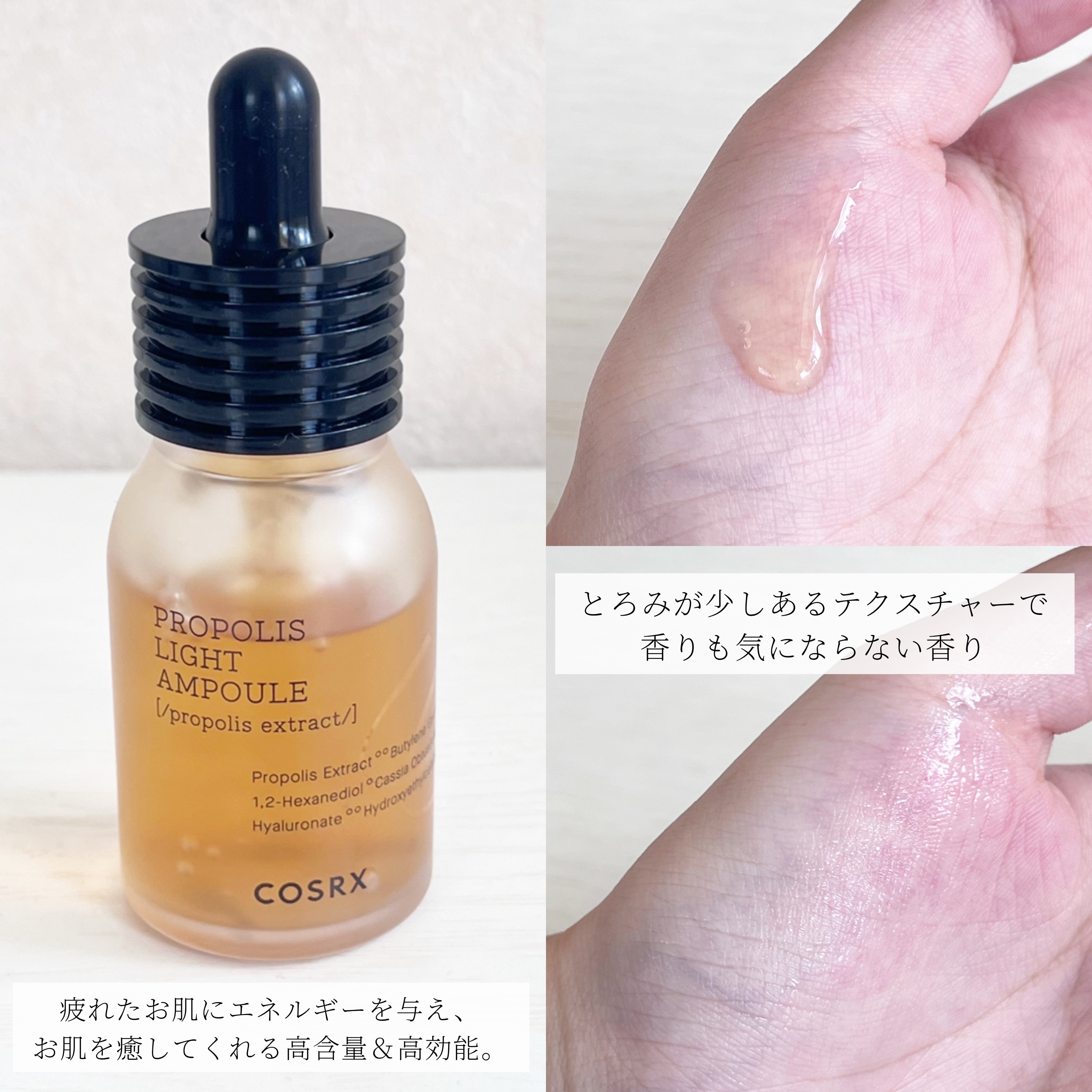 プロポリスエキスがトナー・・72.6% アンプル・・83%だそうです。 香りはほぼないです。めっちゃ使いやすい。 トナーはどっちかというとシャバシャバ系のテクスチャー。 特に化粧水はストック買いしたいと思うほどに気に入った💞