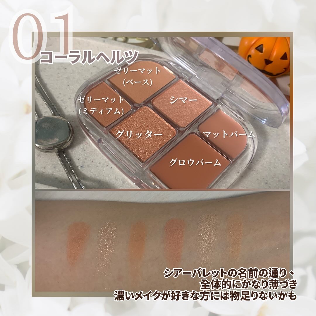 ˗ˏˋwakemake ソフトシアーマルチパレットˎˊ˗01コーラルヘルツ名前のとおり、めちゃくちゃソフトシアーな発色で、私は少し物足りなさを感じた。バームはチークに使ったけど、バームの発色はよかった!!色味がドンピシャなのに、シアーす...