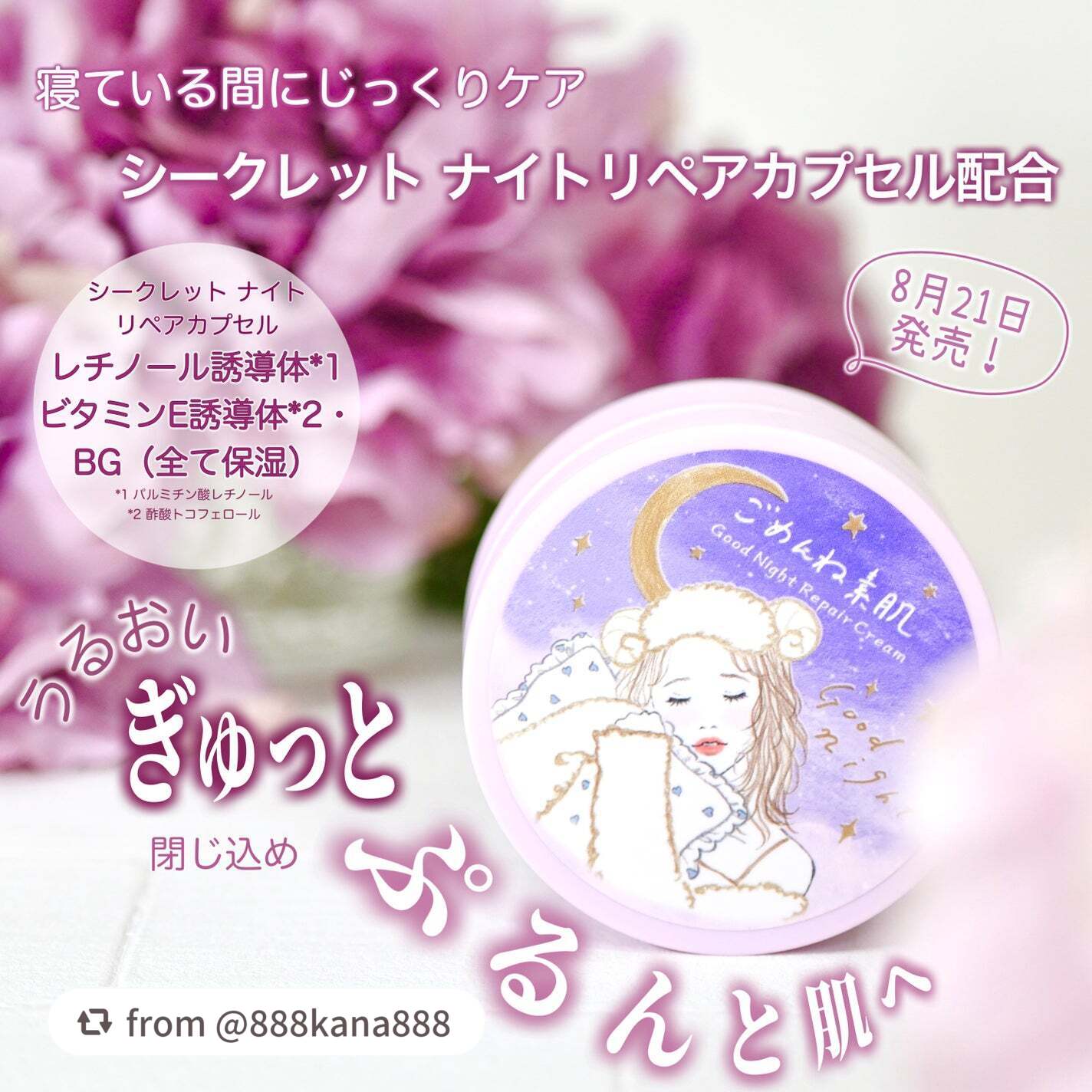 - 日中に負担をかけてしまった肌*を、寝ている間に集中ケアできる『おやすみリペアクリーム』 ①負担をかけた肌*も、寝ている間に集中ケア 摩擦感なく伸び広がり、ピタッと密着。夜の肌刺激(乾燥・摩擦)から守りながら、日中受けたダメージ*を集中ケアし、8時間熟睡したような肌へ導きます。 ②あれがちな肌にも使いやすい低刺激設計 弱酸性・無香料・無着色・アルコールフリー・パラベンフリー・紫外線吸収剤フリーの低刺激処方で、やさしい使い心地です。 *乾燥による