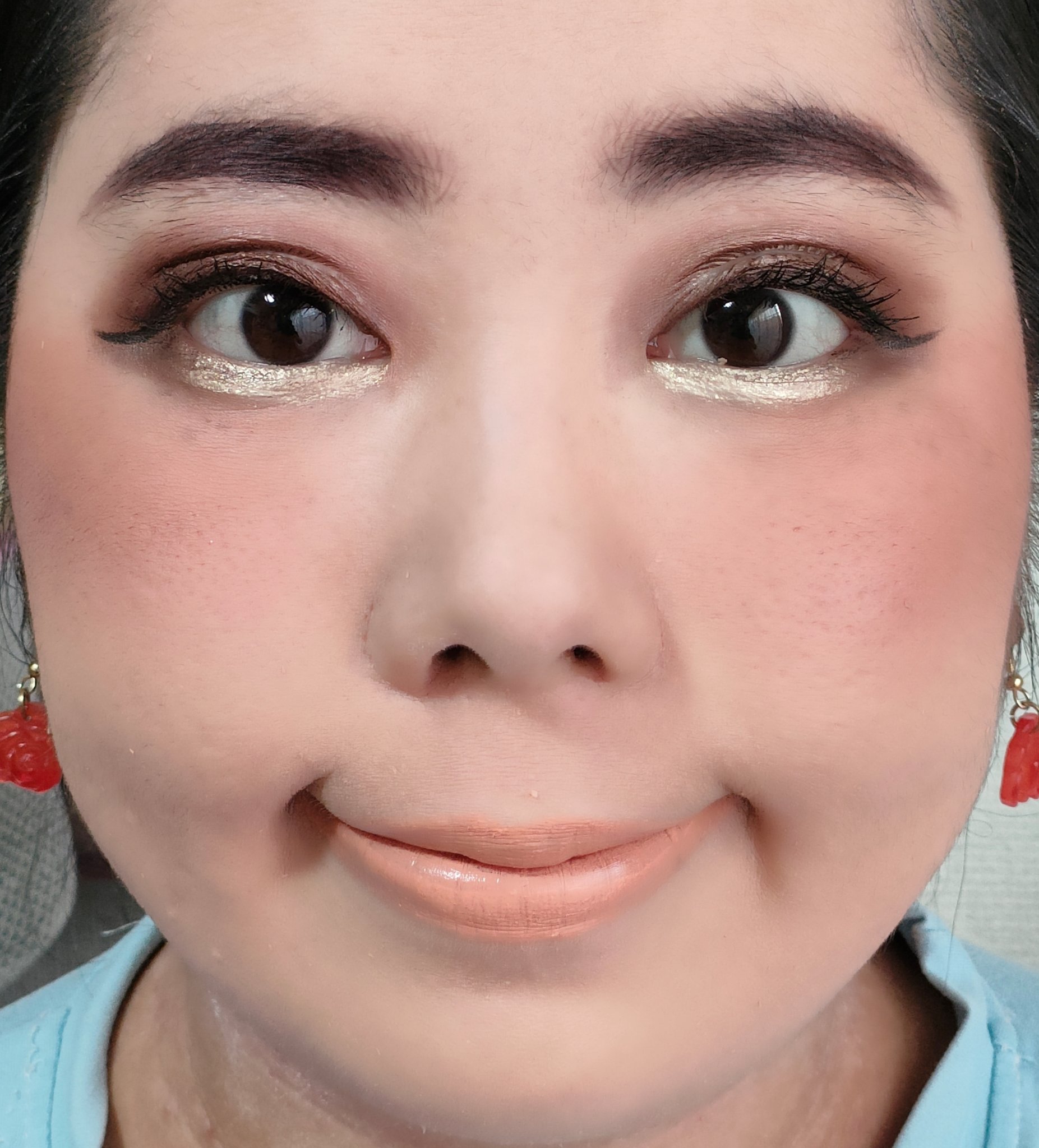 アリィー ニュアンスチェンジUV ジェル RSを、顔全体にまんべんなく塗ります。 RMK RMK ジェルクリーミィファンデーション 103を、顔全体にまんべんなく塗ります。 ジョンソンベビー ジョンソン ベビーパウダーを、顔全体にまんべんなく軽くはたきます。 THE BODY SHOP bronze shade warm glowを、両頬に塗ります。 KATE リフレクトミラーアイズ BR-1の締め色を、眉毛全体にまんべんなく塗ります。 URGLAM UR GLAMBLOOMING EYE COLOR PALETTE 01を、使用しました。 ちふれ リキッド アイライナー 筆ペンタイプ BK30 ブラックを、塗ります。 CEZANNE エアリーカールマスカラを、まつ毛全体にまんべんなく塗ります。 MAYBELLINE NEW YORK コロッサルボリュームエクスプレスを、まつ毛全体にまんべんなく塗ります。 MAYBELLINE NEW YORK SPステイ マットインク 135を、唇全体にまんべんなく塗ります。