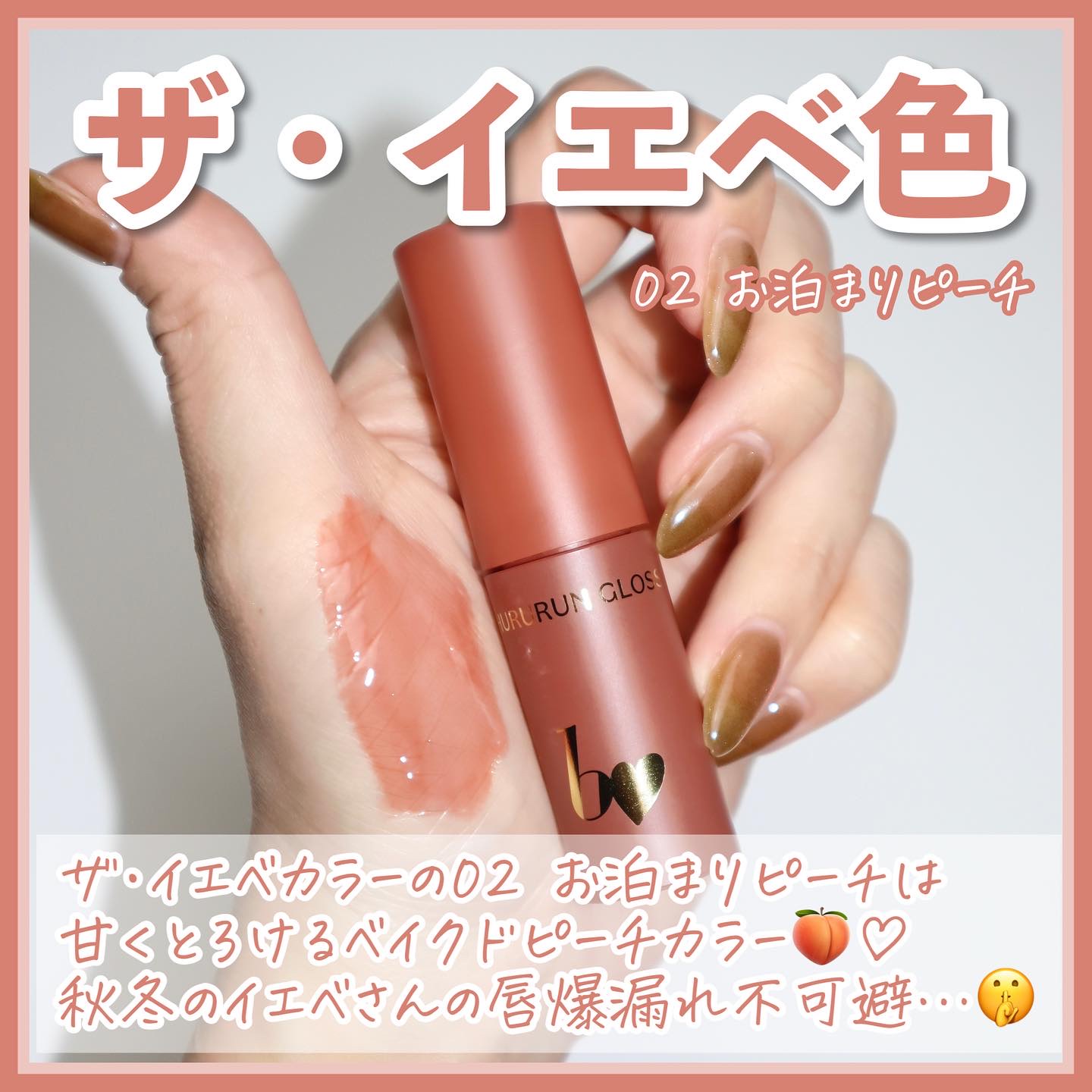 - 【重ねて塗って、唇だけで虜にする。】 むっちりぷっくり*1艶リップを演出♥ 24SS新定番発売! 「スキンケア感覚の艶グロス」 “ちゅるるんグロス” ラップパック×美容成分配合*2×潤いを閉じ込める こっくり系テクスチャーでぷっくりツヤツヤ。 美容成分がたっぷりで、ぴったり密着ラッピング。 乾燥から唇を保護します。 ぽってり*1♡うるちゅるな唇を演出。 ♥「01 ヌードスキン」うるうるしながら、可愛く守る。 *1 メイク効果による *2 シア脂、ツバキ種子油、カニナバラ果実油、セラミドNP、ティーツリーエキス、ヒアルロン酸Na、ツボクサエキス(全て保湿成分) うるうるしながら、可愛く守る。 スキンケア感覚の艶グロス。