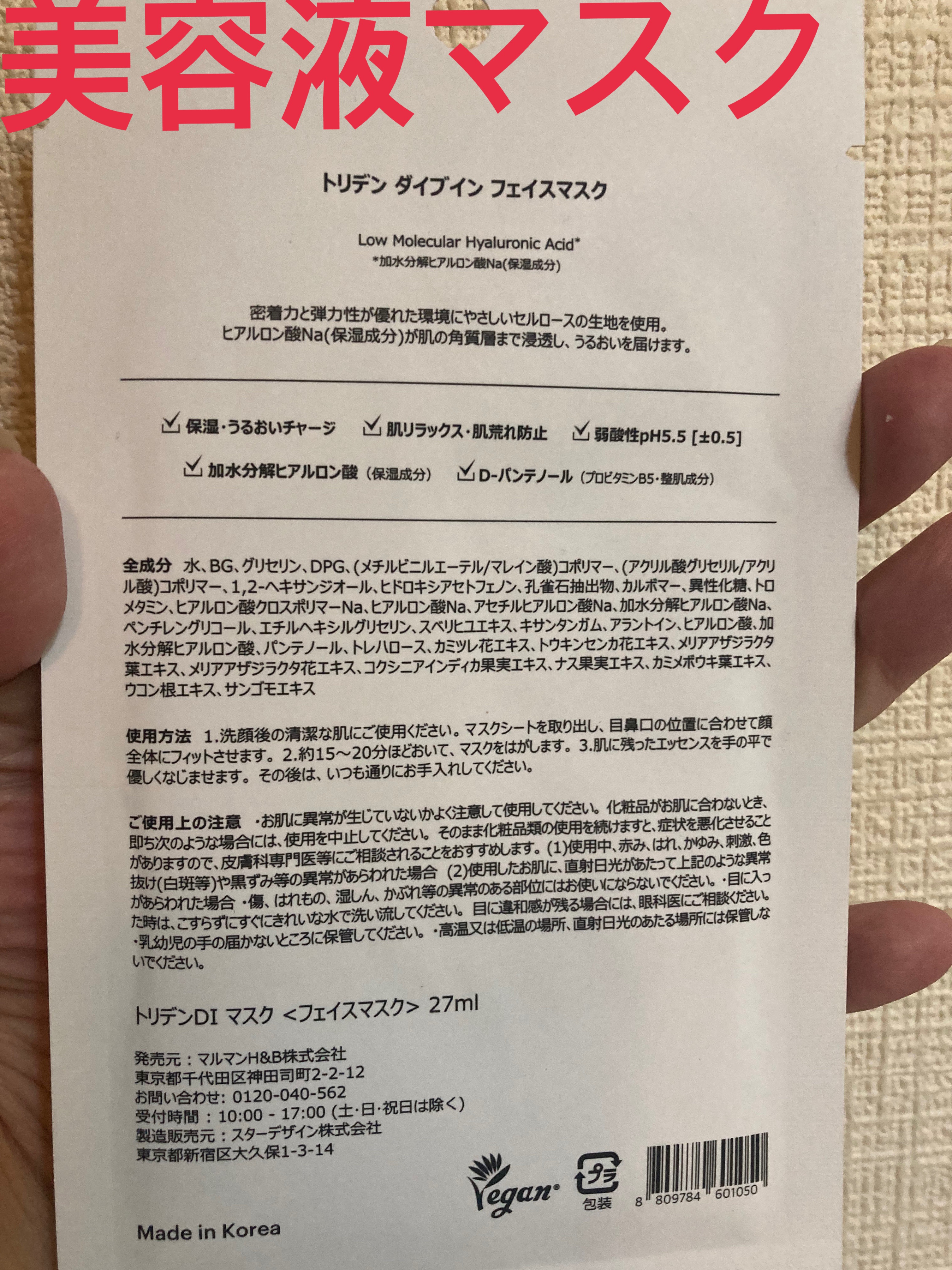 - <1枚> 水、BG、グリセリン、DPG、(メチルビニルエーテル/マレイン酸)コポリマー、(アクリル酸グリセリル/アクリル酸)コポリマー、1,2-ヘキサンジオール、ヒドロキシアセトフェノン、孔雀石抽出物、カルボマー、異性化糖、トロメタミン、ヒアルロン酸クロスポリマーNa、ヒアルロン酸Na、アセチルヒアルロン酸Na、加水分解ヒアルロン酸Na、ペンチレングリコール、エチルヘキシルグリセリン、スベリヒユエキス、キサンタンガム、アラントイン、ヒアルロン酸、加水分解ヒアルロン酸、パンテノール、トレハロース、カミツレ花エキス、トウキンセンカ花エキス、メリアアザジラクタ葉エキス、メリアアザジラクタ花エキス、コクシニアインディカ果実エキス、ナス果実エキス、カミメボウキ葉エキス、ウコン根エキス、サンゴモエキス <3枚> 水、BG、グリセリン、DPG、(メチルビニルエーテル/マレイン酸)コポリマー、(アクリル酸グリセリル/アクリル酸)コポリマー、1,2-ヘキサンジオール、ヒドロキシアセトフェノン、乳雀石抽出物、カルボマー、異性化糖、トロメタミン、ヒアルロン酸クロスポリマーNa、ヒアルロン酸Na、アセチルヒアルロン酸Na、加水分解ヒアルロン酸Na、ペンチレングリコール、エチルヘキシルグリセリン、スベリヒユエキス、キサンタンガム、アラントイン、ヒアルロン酸、加水分解ヒアルロン酸、パンテノール、トレハロース、カミツレ花エキス、トウキンセンカ花エキス、メリアアザジラクタ葉エキス、メリアアザジラクタ花エキス、コクシニアインディカ果実エキス、ナス果実エキス、カミメボウキ葉エキス、ウコン根エキス、サンゴモエキス <10枚> 水、BG、グリセリン、DPG、(メチルビニルエーテル/マレイン酸)コポリマー、(アクリル酸グリセリル/アクリル酸)コポリマー、1,2-ヘキサンジオール、ヒドロキシアセトフェノン、孔雀石抽出物、カルボマー、異性化糖、トロメタミン、ヒアルロン酸クロスポリマーNa、ヒアルロン酸Na、アセチルヒアルロン酸Na、加水分解ヒアルロン酸Na、ペンチレングリコール、エチルヘキシルグリセリン、スベリヒユエキス、キサンタンガム、アラントイン、ヒアルロン酸、加水分解ヒアルロン酸、パンテノール、トレハロース、カミツレ花エキス、トウキンセンカ花エキス、メリアアザジラクタ葉エキス、メリアアザジラクタ花エキス、コクシニアインディカ果実エキス、ナス果実エキス、カミメボウキ葉エキス、ウコン根エキス、サンゴモエキス