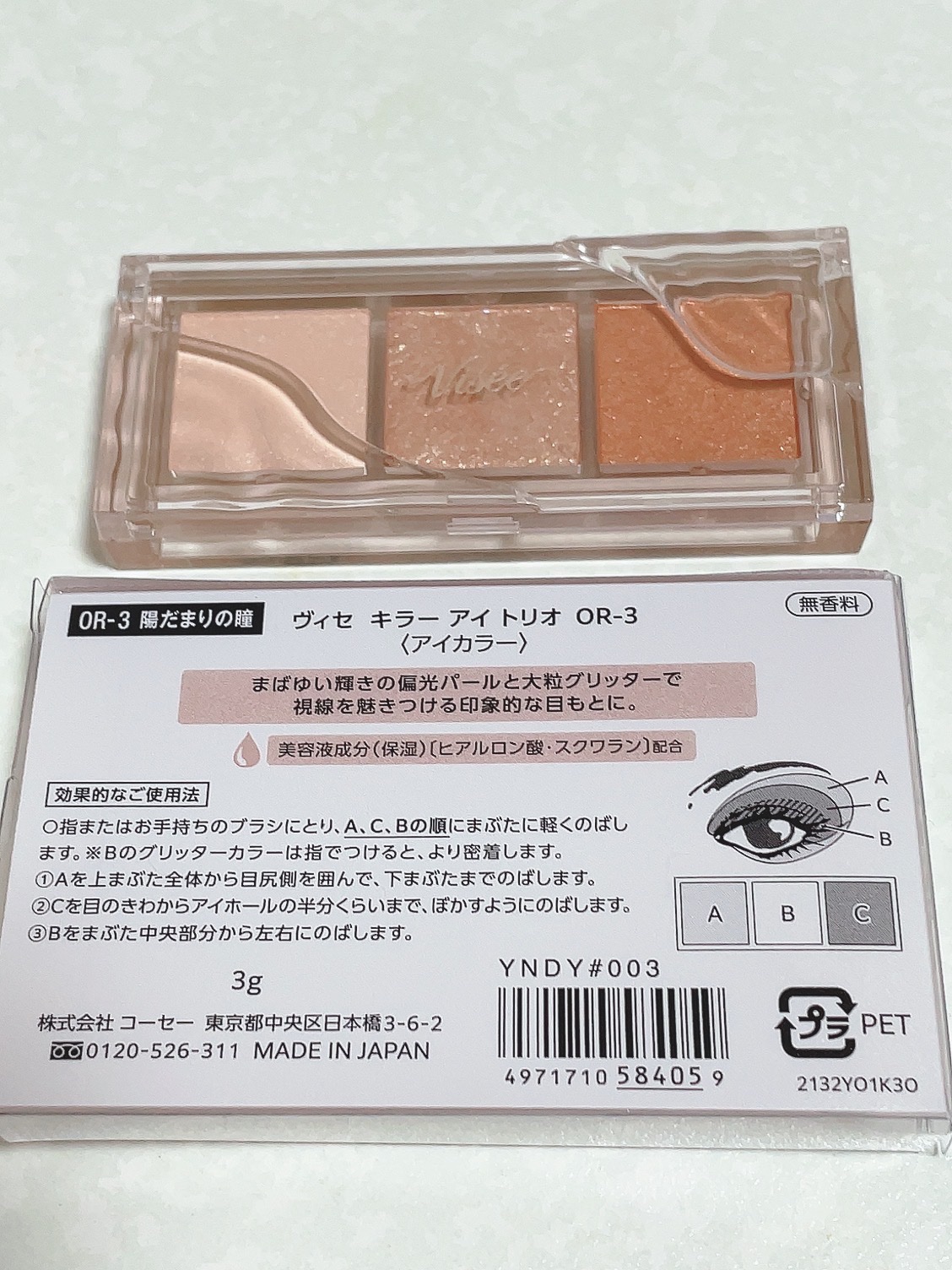 - 角度によって色が変わる高輝度偏光パールを多量配合。動くたび輝きが変化する高密着な3色入りセットアイカラー。 ● 高輝度偏光パールと大粒グリッターを贅沢に配合した、3 色セットのアイカラーです。 まぶたにしっとりとけこむようにフィットして、大粒パールやグリッターも高密着。 大胆に輝き、色気を放つ目もとがつづきます。 ● 見る角度や光の当たり具合により色味が変化する高輝度偏光パール(カラーチェンジグリッター)とクリアで高輝度な大粒グリッターを組み合わせて配合。 まばたきや動きにより色と輝きが変化する、魅力的な目もとを演出します。 ● 化粧もちを高めるフィットオイル成分配合。まぶたにピタッと密着し、パール落ちを防止。 高い透明感とツヤ感も付与し、美しい仕上がりが持続します。 ● カラーによって異なるベースを採用。 [ハイライトカラー(A)] もちっと生質感で、肌にとけこむように密着するスフレベース。 繊細なパールの輝きで、まぶたに光を取りこみ、下地効果でアイカラーの密着も高めます。 [グリッターカラー(B)] 輝きを最大限に引き出す透明性の高いベースに、高輝度偏光パールと大粒グリッターを贅沢に配合。 密着性の高いフィットオイル成分とペーストオイルをかけあわせることで、パール落ちも防止。 [アクセントカラー(C)] のび広がりのよさと高い密着性を両立して美発色を叶えたベース。 フィットオイル成分を最高量配合(パレット内比)し、粉体をコーティングすることで クリアで美しい発色と上質なツヤが持続します。 ● 無香料
