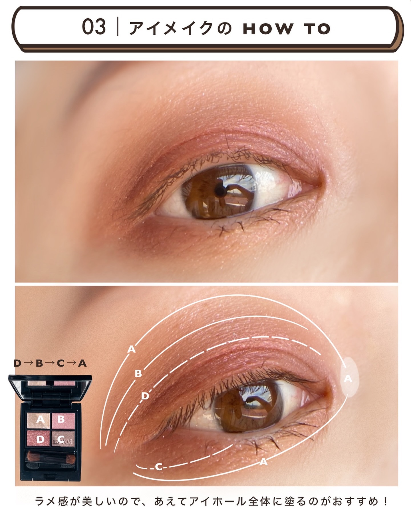 ぷにっとした弾力のある触り心地に、しっとりクリーミィなテクスチャー。 アイグロウジェムといえばこのカラーと言っても過言ではないくらい、初めましての方にもおすすめのカラーなんだとか✨ ちょっとオレンジ味もあるようなピンクベージュには繊細なラメがたっぷり、キラッキラと煌めきます。 でもここはさすがデコルテ、品があって透明感のあるラメ感なのでぎらつくこともなく、上品でうるっとしたアイメイクに。 そして肌馴染みの良いベージュにほんのりと感じるピンクが、じゅわっと滲み出るような血色感をプラスしてくれてこれまた可愛いんです…!ヌーディ過ぎない絶妙な色出しなので、これ単色で使っても充分すぎるくらい可愛い!時短にもなるのに抜け感が出てお洒落な雰囲気になれますよ〜! お値段も高過ぎないし、ラメの繊細な煌めきも美しいし、クリームみたいなテクスチャーなのによれにくいし、これは人気なのも納得だなあ。