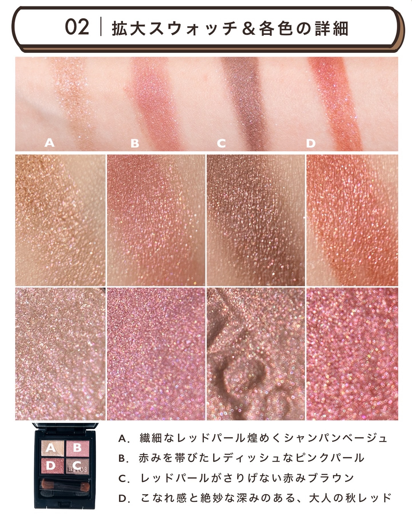 - 敏感肌のまぶたをケアしながら、美しく彩る。ミネラルの色と光を重ねて、メイクするたび自分らしく。 着眼点は「大人のくすみ※1やすい、まぶた」。 敏感になってしまった肌に対し、8種の美容成分※2がうるおいを与えながら丁寧にケアします。 なりたい表情をメイクで叶えながら、健やかな透明感※3のあるまぶたへ。 大人の目もとを上品なツヤと発色で彩る4色アイカラーは、まぶたに吸い付くような質感で、澄んだ眼差しを演出します。 心のままに色を重ねて、なりたい自分を描いて。 ※1 乾燥によるもの ※2 保湿成分:ヒアルロン酸Na、ポリクオタニウム-61、シロキクラゲ多糖体、アシタバ葉/茎エキス、クダモノトケイソウ果実エキス、モモ花エキス 整肌成分:グリチルレチン酸ステアリル、グリチルリチン酸2K ※3 メイクアップ効果による