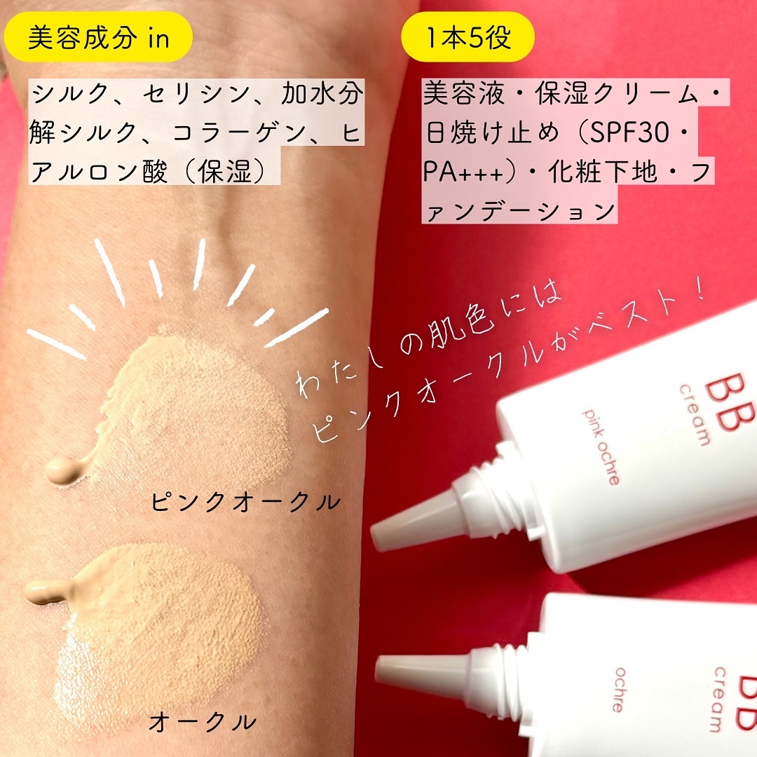 - <オークル> 水、シクロペンタシロキサン、BG、トリエチルヘキサノイン、PEG-10ジメチコン、グリセリン、(HDI/トリメチロールへキシルラクトン)クロスポリマー、カプリリルメチコン、トリメチルシロキシケイ酸、ソルビトール、シルク、セリシン、加水分解シルク、加水分解コラーゲン、水溶性コラーゲン、水溶性コラーゲンクロスポリマー、ヒアルロン酸Na、グリチルリチン酸2K、ローズマリー葉油、PEG/PPG/ポリブチレングリコール-8/5/3グリセリン、ペンチレングリコール、ジメチコン、メタクリル酸メチルクロスポリマー、硫酸Mg、シリカ、ジステアルジモニウムヘクトライト、PEG-9ジメチコン、クエン酸Na、トコフェロール、トリエトキシカプリリルシラン、ハイドロゲンジメチコン、酸化亜鉛、酸化チタン、合成フルオロフロゴパイト、酸化鉄、水酸化Al、フェノキシエタノール <ピンクオークル> 水、シクロペンタシロキサン、BG、トリエチルヘキサノイン、PEG-10ジメチコン、グリセリン、(HDI/トリメチロールへキシルラクトン)クロスポリマー、カプリリルメチコン、トリメチルシロキシケイ酸、ソルビトール、シルク、セリシン、加水分解シルク、加水分解コラーゲン、水溶性コラーゲン、水溶性コラーゲンクロスポリマー、ヒアルロン酸Na、グリチルリチン酸2K、ローズマリー葉油、PEG/PPG/ポリブチレングリコール-8/5/3グリセリン、ペンチレングリコール、ジメチコン、メタクリル酸メチルクロスポリマー、硫酸Mg、シリカ、ジステアルジモニウムヘクトライト、PEG-9ジメチコン、クエン酸Na、トコフェロール、トリエトキシカプリリルシラン、ハイドロゲンジメチコン、酸化亜鉛、酸化チタン、合成フルオロフロゴパイト、酸化鉄、水酸化Al、フェノキシエタノール