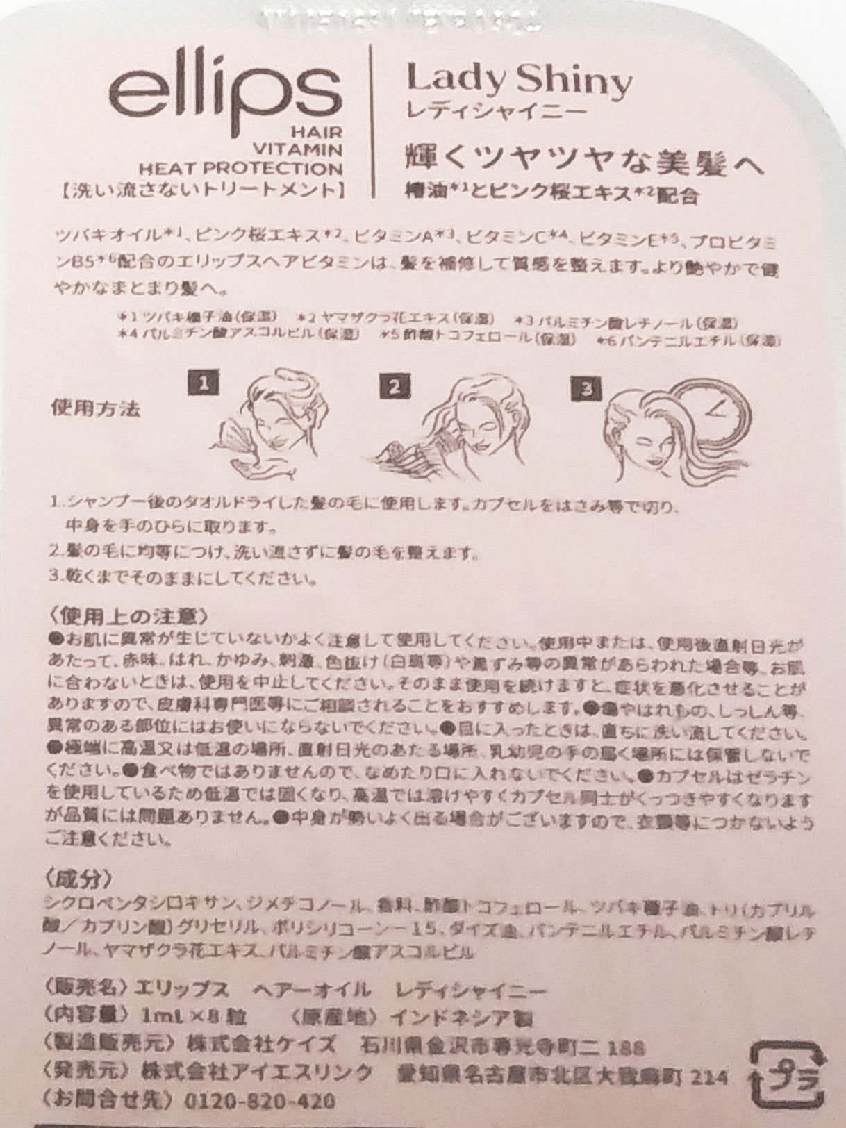 ※2023年使用品ヘアオイル・商品名ellips(エリップス)『日本限定』 ヘアーオイル レディシャイニー ピュアナチュラ・値段定価330円(165円で購入)・購入場所カワチ・評価★★☆☆☆重めですきなんだけど、単体だと1回2粒使うからコスパ...
