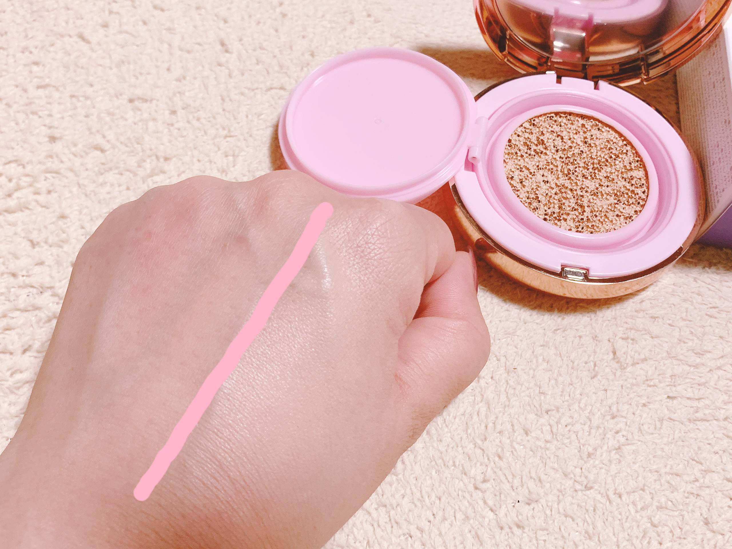 混合肌や敏感肌におすすめのピンクティーツリーカバープライマークッション カラーは『21号』を使用しました! SPF50+ PA++++の高UVカットのクッションファンデーション うるおい感がありながら、ピタッと肌に密着してくれるテクスチャ