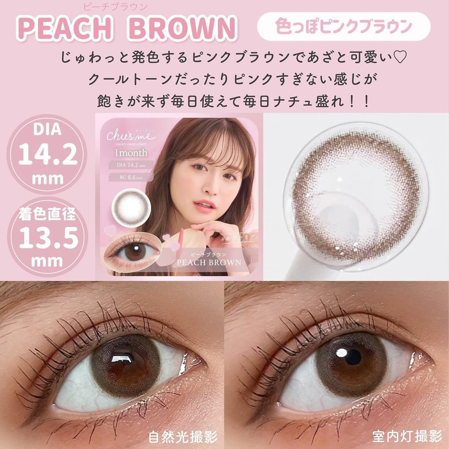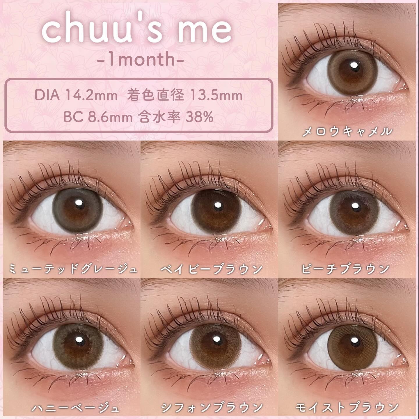 - ※2025年10月中旬より、商品パッケージ順次リニューアル。(レンズスペック・その他情報は変更ございません)尚、パッケージリニューアルに伴う商品の返品・交換は承っておりません。 まるでティントで染めたように色づく、こだわりの「あざと盛れレンズ」が登場 細すぎず、太すぎない絶妙なちゅるんフチとジューシーな色めくティントカラーで、こだわりのあざと盛れレンズがマンスリー限定色としてラインナップに加わりました。 近年ではカラーコンタクトを選ぶときにパーソナルカラーを重視するというユーザーからの意見を参考に商品開発を行い、イエベさんにはつやめく甘みベージュのメロウキャメル、ブルべさんには色っぽさ溢れるミューテッドグレージュがそれぞれの魅力を引き立てるカラーとなっております。 お好きなスタイルやメイクに合わせてお楽しみください。 ●BABY BROWN(ベイビーブラウン) 赤ちゃんの瞳のような透明感演出。ピュアな裸眼系ブラウン。 ●PEACH BROWN(ピーチブラウン) じゅわっと溶け込むように馴染む、あざとピンクブラウン。 ●HONEY BEIGE(ハニーベージュ) 透明感があふれだす、儚げラテベージュ。 ●CHIFFON BROWN(シフォンブラウン) アンニュイな透け感がポイント。ふわっと色素薄い系ブラウン。 ●MOIST BROWN(モイストブラウン) 茶フチが演出する”うるおい”感。甘え上手なちゅるんブラウン。 ●MELLOW CAMEL(メロウキャメル) ちゅるんとしたティントカラーに惹き込まれる 甘ツヤうぶベージュ。 ●MUTED GREIGE(ミューテッドグレージュ) 透明感たっぷりのくすみカラーで 仕上げる色っぽグレージュ。 ●BRULEE CHARM(ブリュレチャーム) 瞳をくりっと見せる濃厚フチ、溶け込むとろ甘焦がしブラウン。 ●BABY MORE(ベイビーモア) ベイビーブラウンのサイズアップ♡ もっとちゅるんと盛れ感をプラス、愛されモテブラウン。 カラーコンタクトレンズの不適正使用による眼障害の危険性等などがあります。 ●コンタクトレンズは高度管理医療機器です。不十分な洗浄・消毒など不適切なケアや、長時間・交換期間を超えた装用により、アレルギー性結膜炎、角膜感染症、角膜潰瘍等の重篤な眼障害が発生する危険性があります ●ご使用前に取扱説明書を確認してください 使用上の留意事項 ●眼科医院等を受診してからお求めください ●眼に異常を感じたら直ちにレンズ使用を中止し、お近くの眼科等で診察を受けてください ●医師の指示にしたがってご使用ください ●コンタクトレンズを装用する場合、自覚症状がなくても、眼科医院等での定期検査を受けてください ●レンズに不具合がある場合は使用しないでください