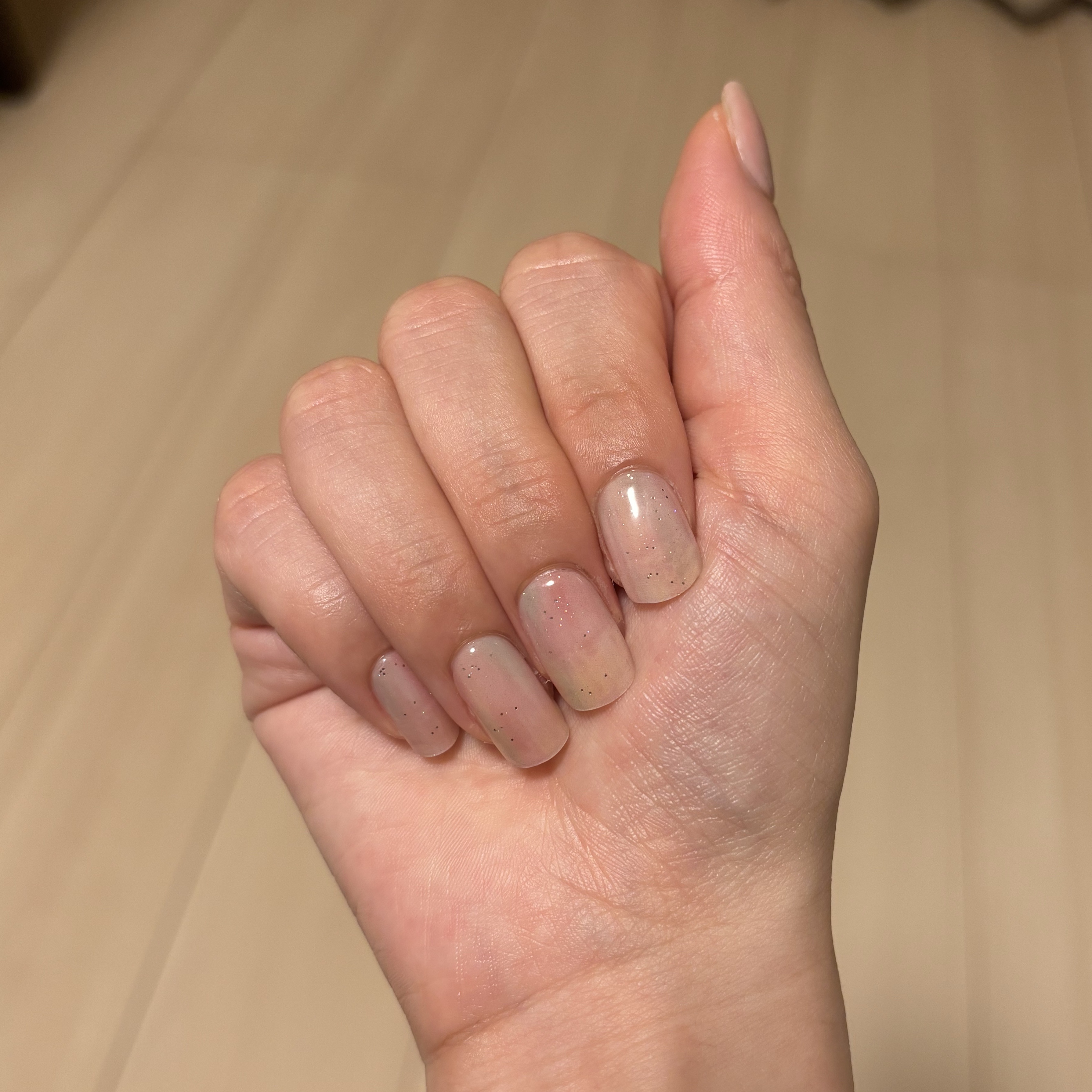 大人の甘さを演出できる、優美な印象のオーロラパウダー入りのパステルピンク。 ほのかに感じるパープルカラーが、指先の透明感をグッと引き立てる。 こんなに肌馴染みが良くないのは初めて🥺 そのせいかシール感がすごい。 シール自体も固くて伸びづらい。 このデザインの特性なのか個体差なのか不明。