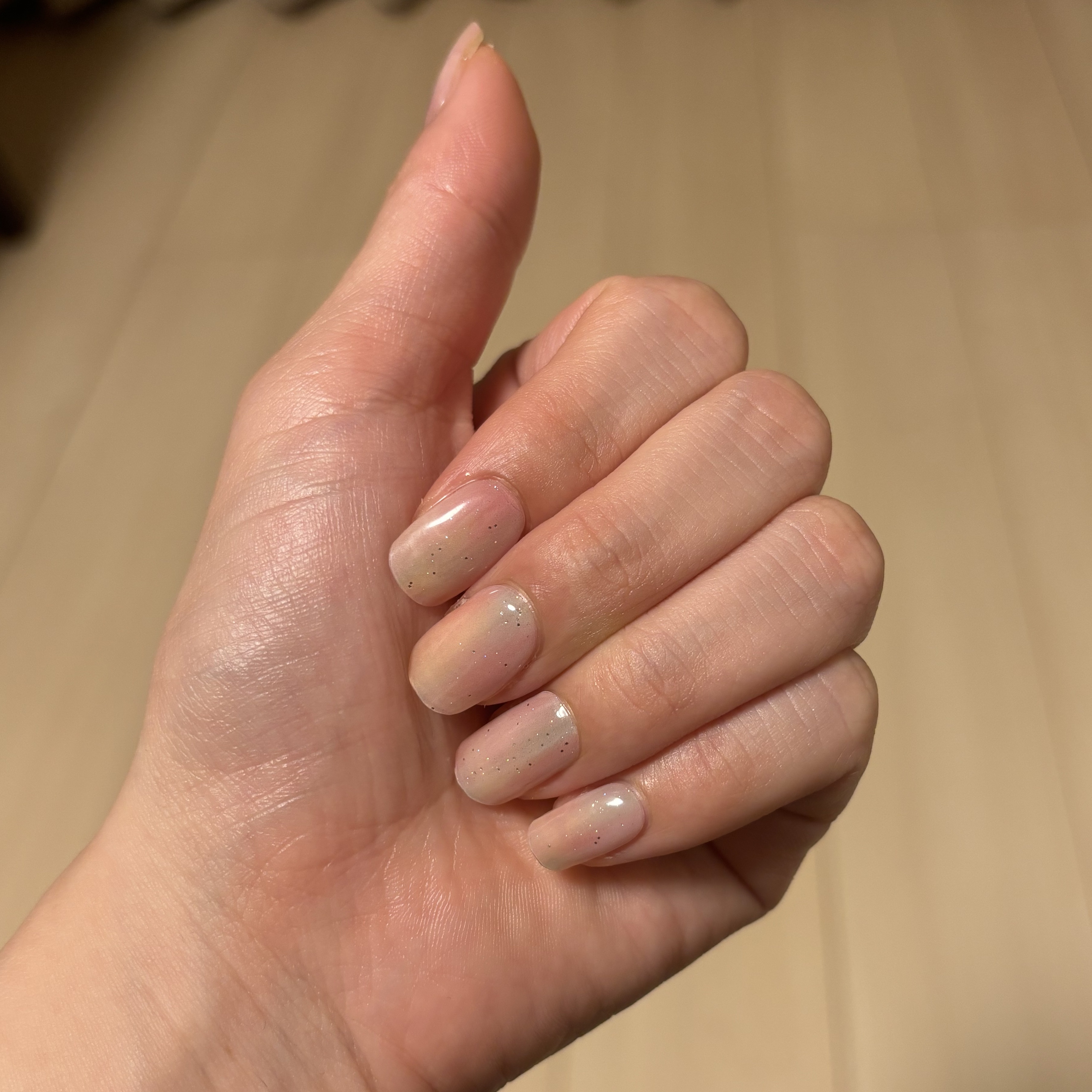 光の当たり具合で肌馴染みのいいグラデにも見え、マグネットキラキラの今風ネイルにも見え、 これは人気そうなデザインですね💫 指が長く見えてよい🫶 オフィスネイルにしてはちょっとキラキラすぎかもな😕 取れなさすぎて、専用リムーバー使ってのオフでもかなりのダメージが... でもohoraにハマりすぎてまたつけてます。笑