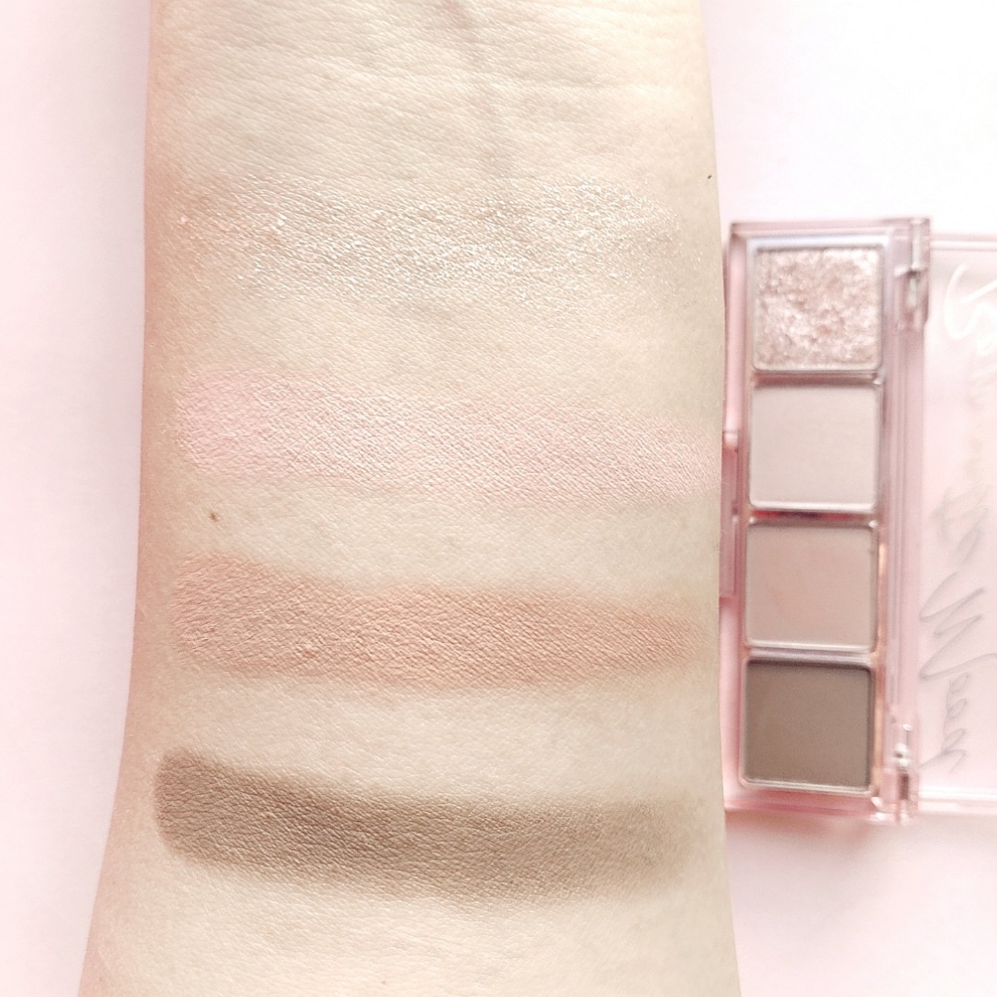 プチプラのクオリティじゃないっ!! 発売前からチェックしていたけれど、ここまで可愛いとは…😆 絶妙カラーで目もとのくすみを飛ばして*明るい印象に🩷 横割りグラデーションでメイクし、立体感をより出したかったので最後に1番左のカラーを上まぶたの真ん中と涙袋にのせています🙆 肌馴染みも良くて粉飛びも感じにくかったです💕 ブラウンの方も店頭に出てたら買おうかな💓