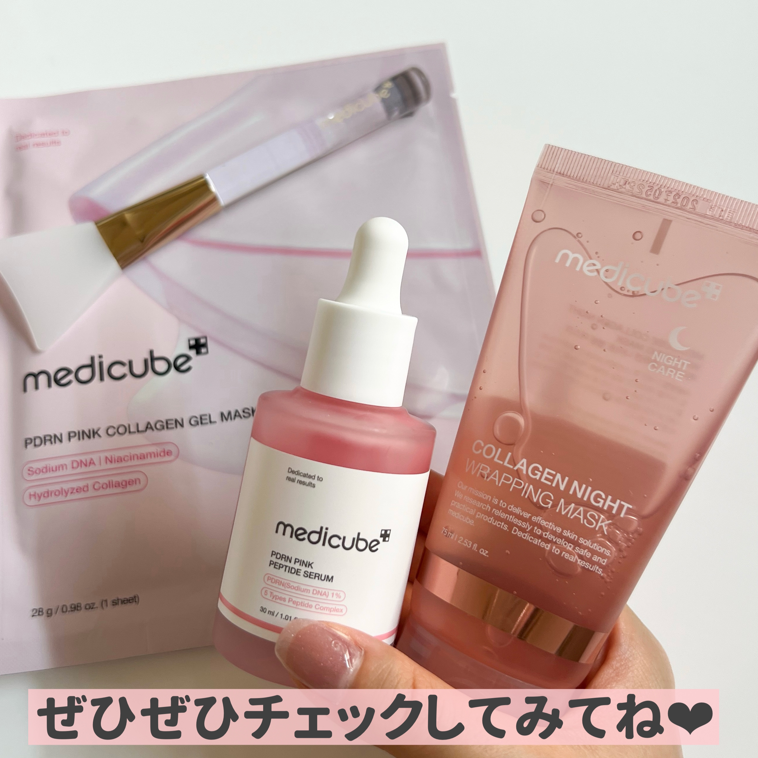 肌が若返るmedicubeのピンク メディキューブで今大人気のピンクのアンプルとアンプル好きな人は絶対合わせて使って欲しいコラーゲンゲルマスク🌷🩰 食べる美容液とも呼ばれるサーモンPDRN DNAに近い成分でコラーゲンの合成をサポートキレイなピンク色はビタミンB12の本来の色なの! マスクはとにかくぷるっぷる...!! 時間が経つとどんどん透けてくる面白い構造剥がした時に小さいのが3つ出てくるんだけどそれはほうれい線や眉間に使えるよ🙆🏻♀️無駄なし!