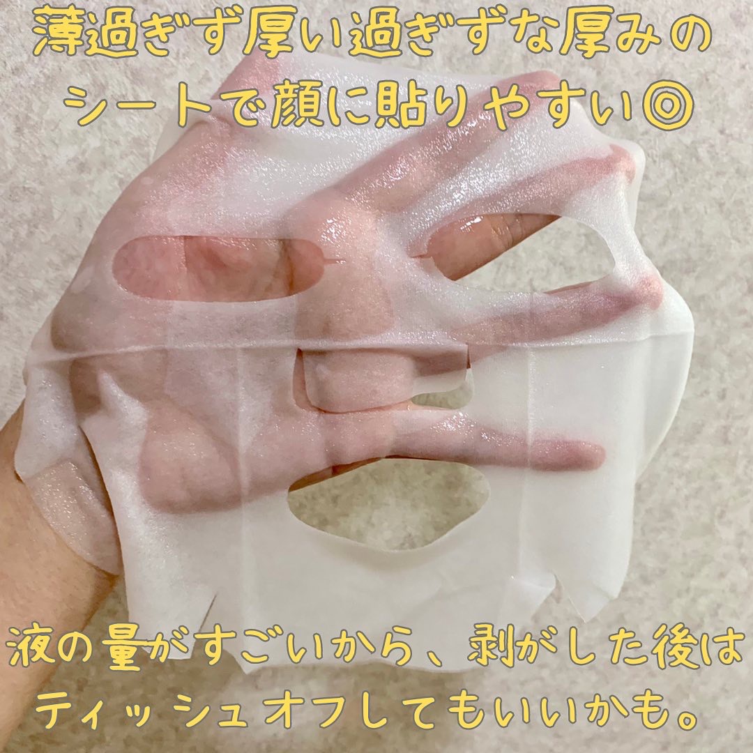 美容液がたっぷり入ったフェイスマスク シートは薄くも厚くもなく肌にぴたっと密着。グルタチオンと5種のビタミンCを配合し純粋ビタミンCとビタミンC誘導体をリポソーム化することで成分の安定性を高めているそう✨ とろみのあるテクスチャーで肌にのせるとさらっとして馴染ませやすくて軽い着け心地。ベタ付かないけど程よい保湿力◎ 混合肌でも使いやすい🥰