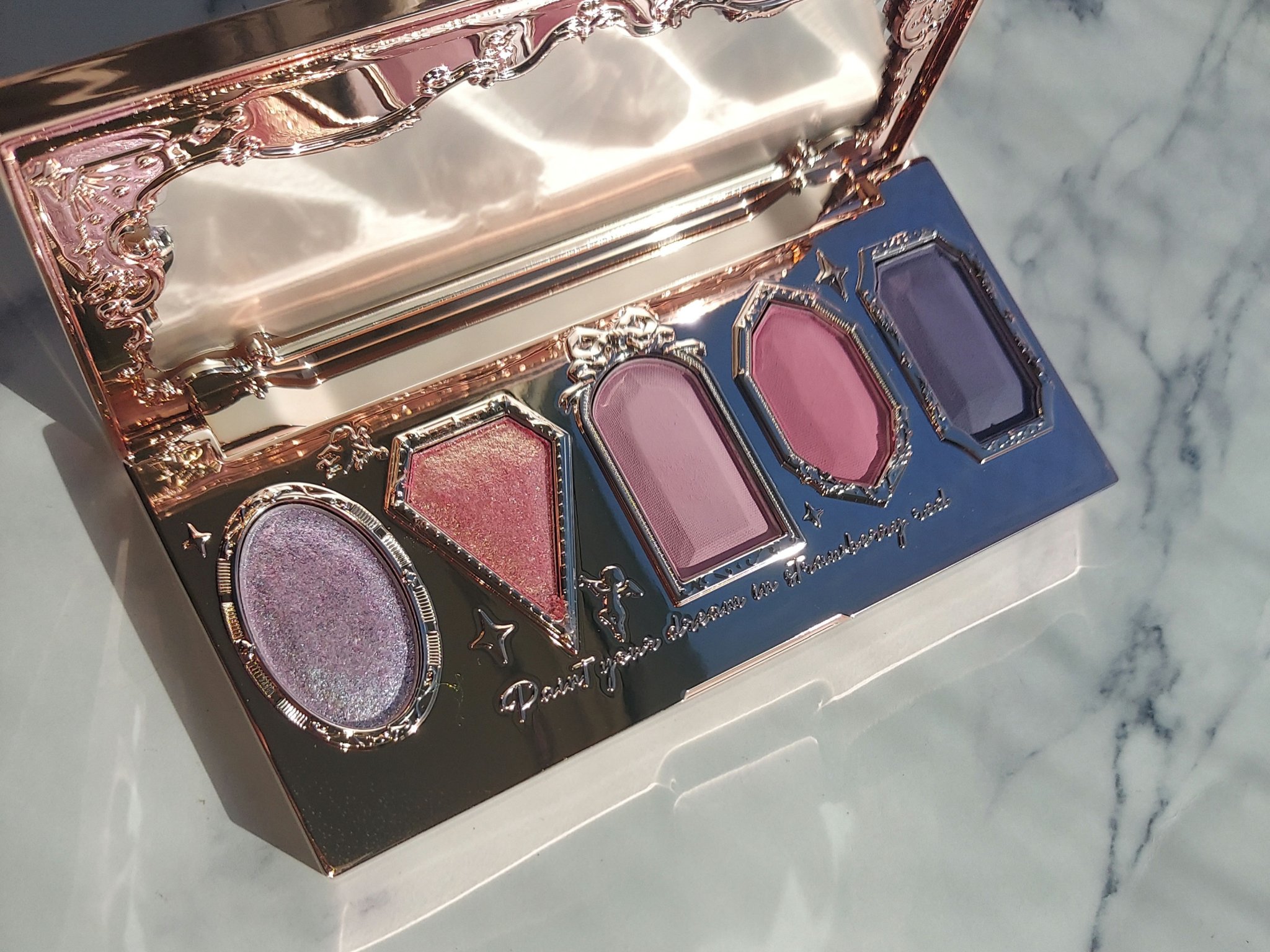 - まるで宝石箱“4+1”マット4色・宝石ラメ1色の粉飛びしにくく心地よいやわらかな感触のパウダーが軽やかにフィットし、洗練された目もとが作れる美しいグラデーションが実現するブラウンメインのアイシャドウパレット。ケースはリボンや七色貝殻に甘い苺スイーツを乗せた宝石箱のデザイン。