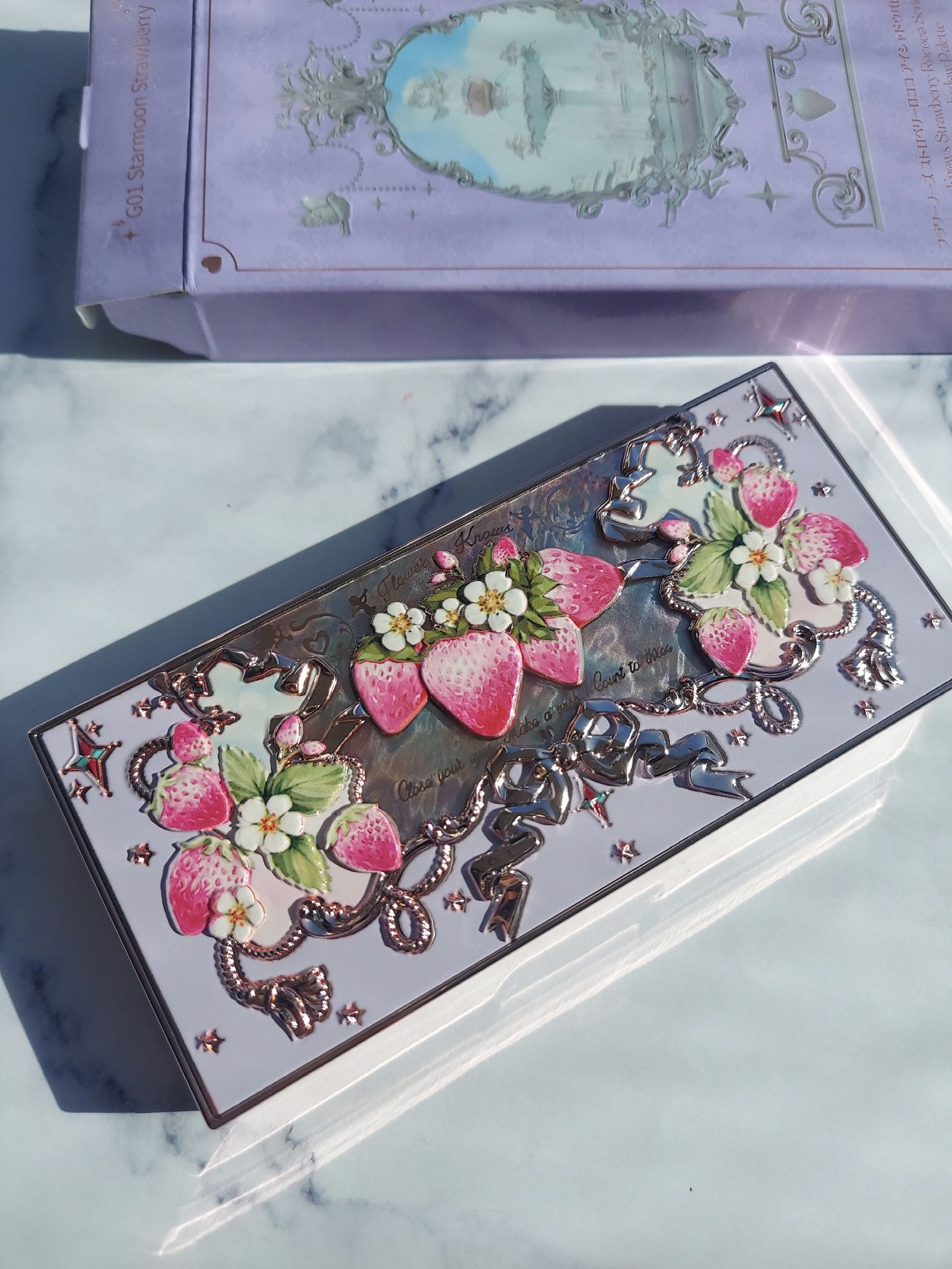 ストロベリーロココ アイシャドウパレット G01スタームーンストロベリー🍓を使ってメイクした時の記録✍️ この時は全色使用してメイクしました! 1番左は青み強めのラメで私の場合広範囲に使うと顔色悪くなるから目頭だけに使ってみたよ!