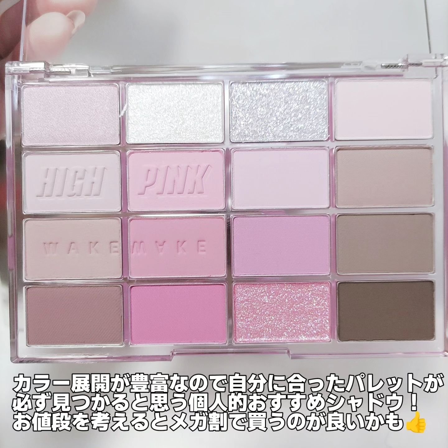 WAKEMAKE人気アイパレット 鮮やかなピンクカラー 色味は青みよりの鮮やかなピンクで鮮やかさが得意なブルベの方におすすめです。 粉質はしっとりしていて発色もいいです。粉飛びもしにくかったです。