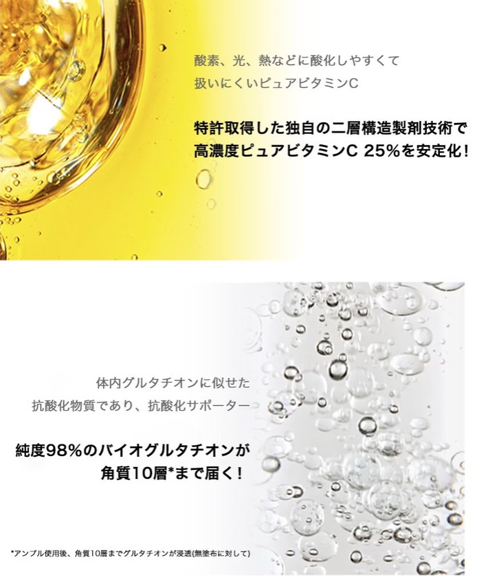 - ビタミンC25%とグルタチオン配合で本格的な美白ケアが叶う。肌のキメ・トーン・シミ・メラニン・角質・ゴワつきなどの肌悩みを改善します