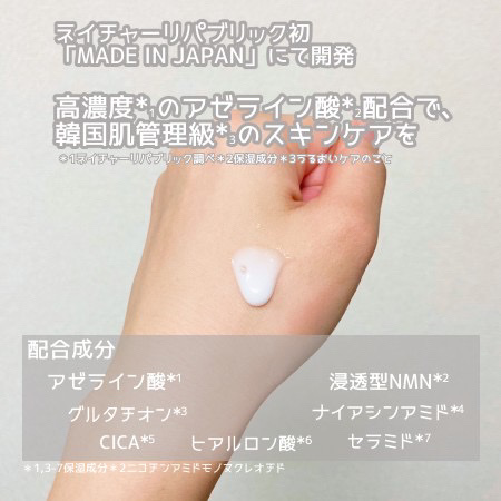 ネイチャーリパブリックって韓国ブランドだよね?それなのにMADE IN JAPAN😗🩵 アゼライン酸はヒマワリ種子油由来の成分で肌荒れなどのケアが期待できるとされているらしい✍️ もったりせず使いやすい質感で強い香りもなし!私は使用感が好きで自然と手が伸びるよ🌱