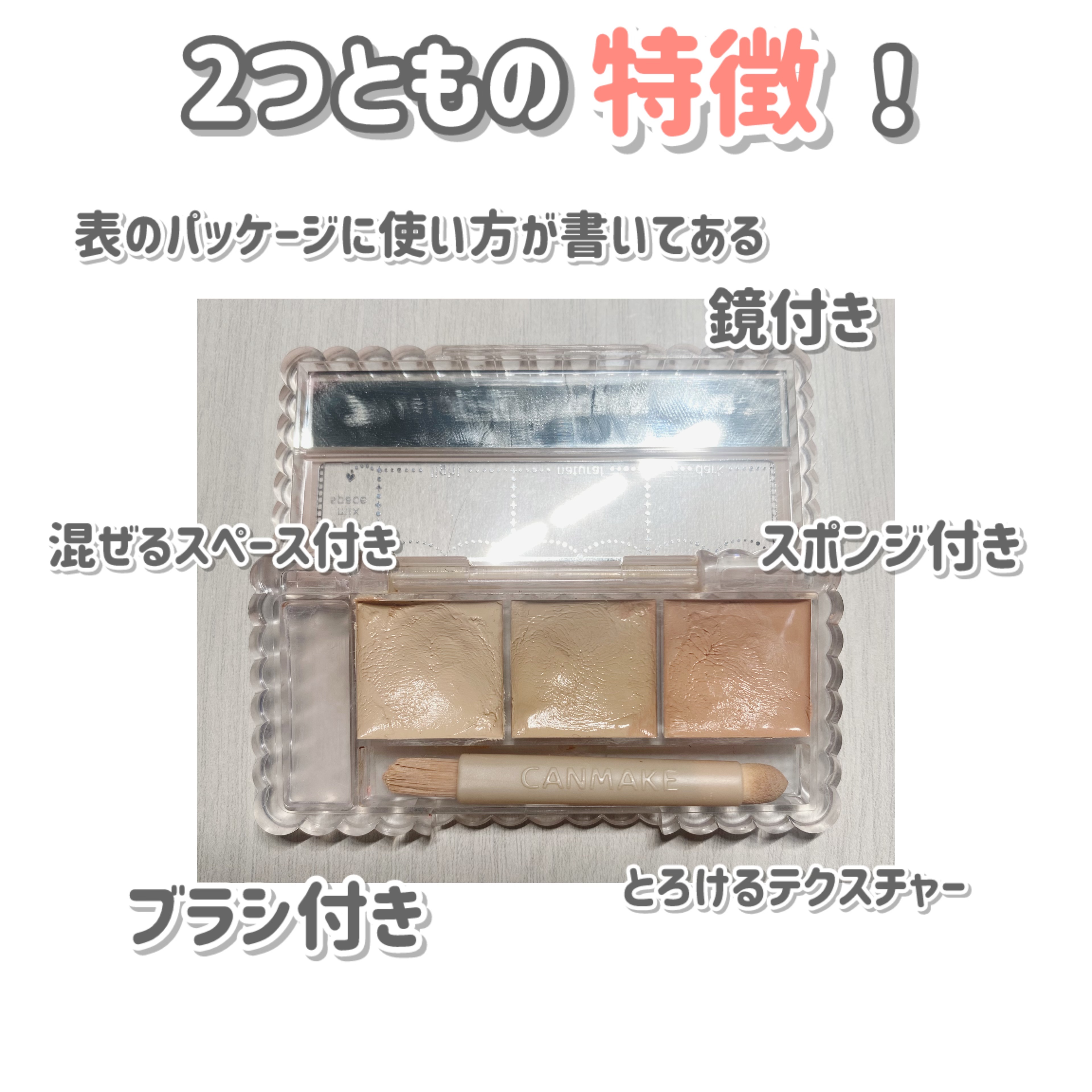 - ※4月下旬よりダブルエンドのチップ&ブラシがリニューアルとなります。 これ1つで自分だけの色が作れる サラサラ仕上げの3色入りパレットコンシーラー これ1つで自分だけの色が作れる3色入りパレットコンシーラー。 ライトカラー・ナチュラルカラー・ダークカラーの3色でお肌の隠したい部分をマルチに高カバー。 カスタマイズできるMIXスペース付で自分だけの色が作れます。 ミラー・ダブルエンドのチップ&ブラシ付。