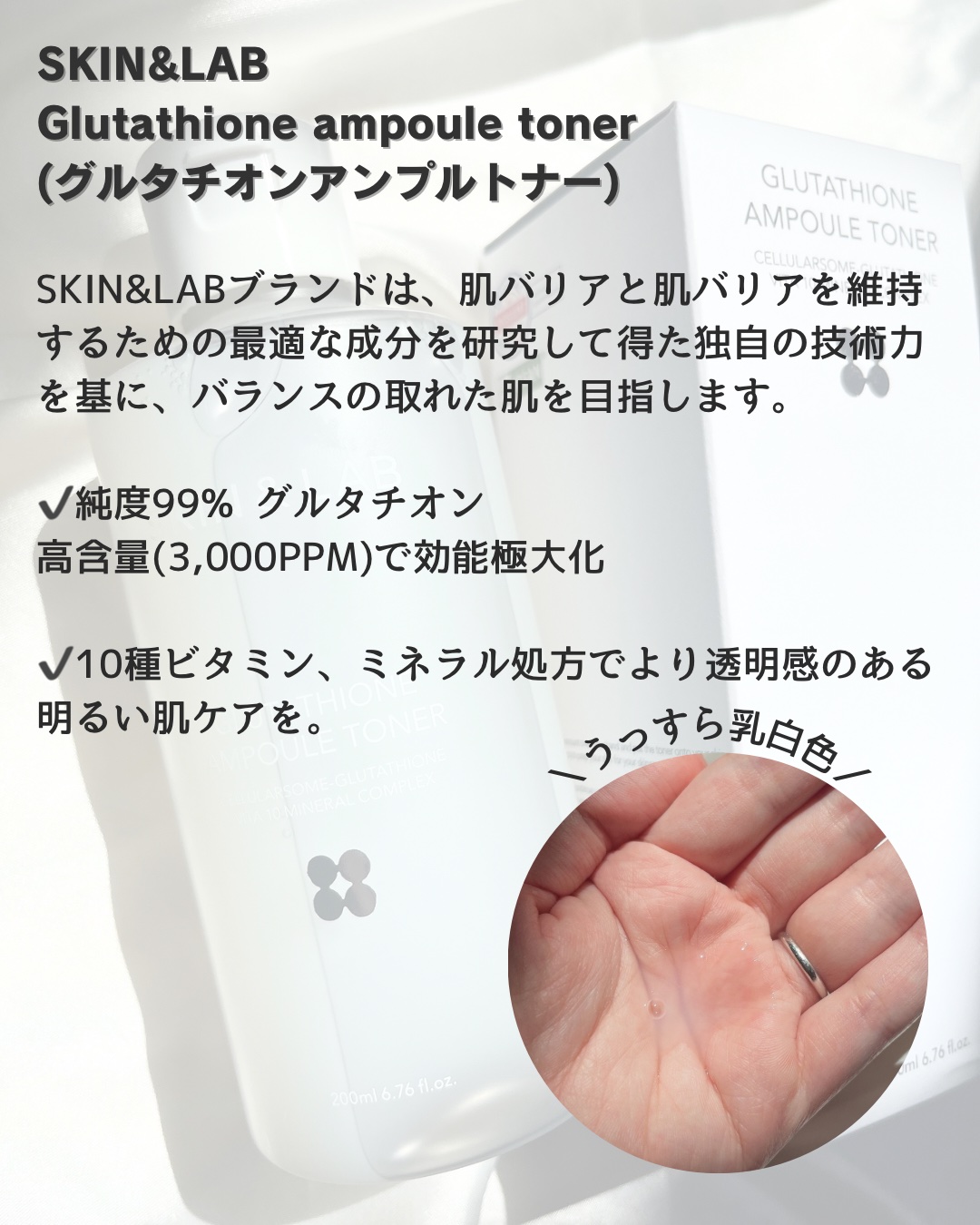 .SKIN&LABグルタチオンアンプルトナーくすみ肌が気になる方におすすめˎˊ˗純度99%グルタチオン高含量(3,000PPM)で効能極大化.ᐟ.ᐟ10種ビタミン、ミネラル処方でより透明感のある明るい肌ケア𓍯.少しだけとろみのあるテクスチャー...