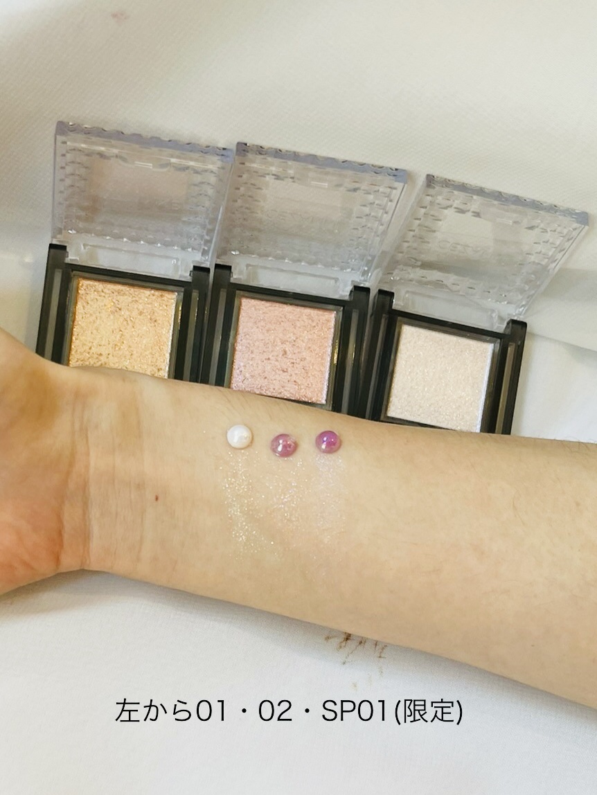 高密着うるみラメ×高彩度ラメシャドウ🥹✨CEZANNEのシングルシャイニーアイシャドウ3色をスウォッチ🌸CEZANNEセザンヌシングルシャイニーアイシャドウ01ムーンジェム/02サクラプリズム/SP1オパールドロップメイクはSP1のオパールド...