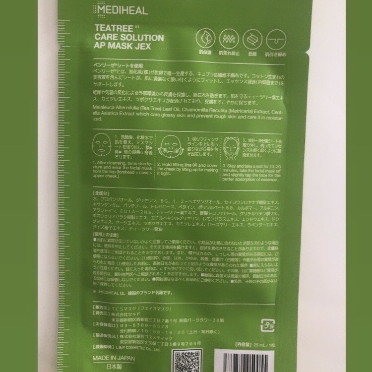 メディヒールの言わずと知れた名品。鎮静効果のあるティーツリーのフェイスマスク! 肌荒れしているときや、日焼けした後におすすめです。 使用感はさっぱりで、これだけでは保湿力が物足りないためクリームなどで蓋をすると良いと思います!
