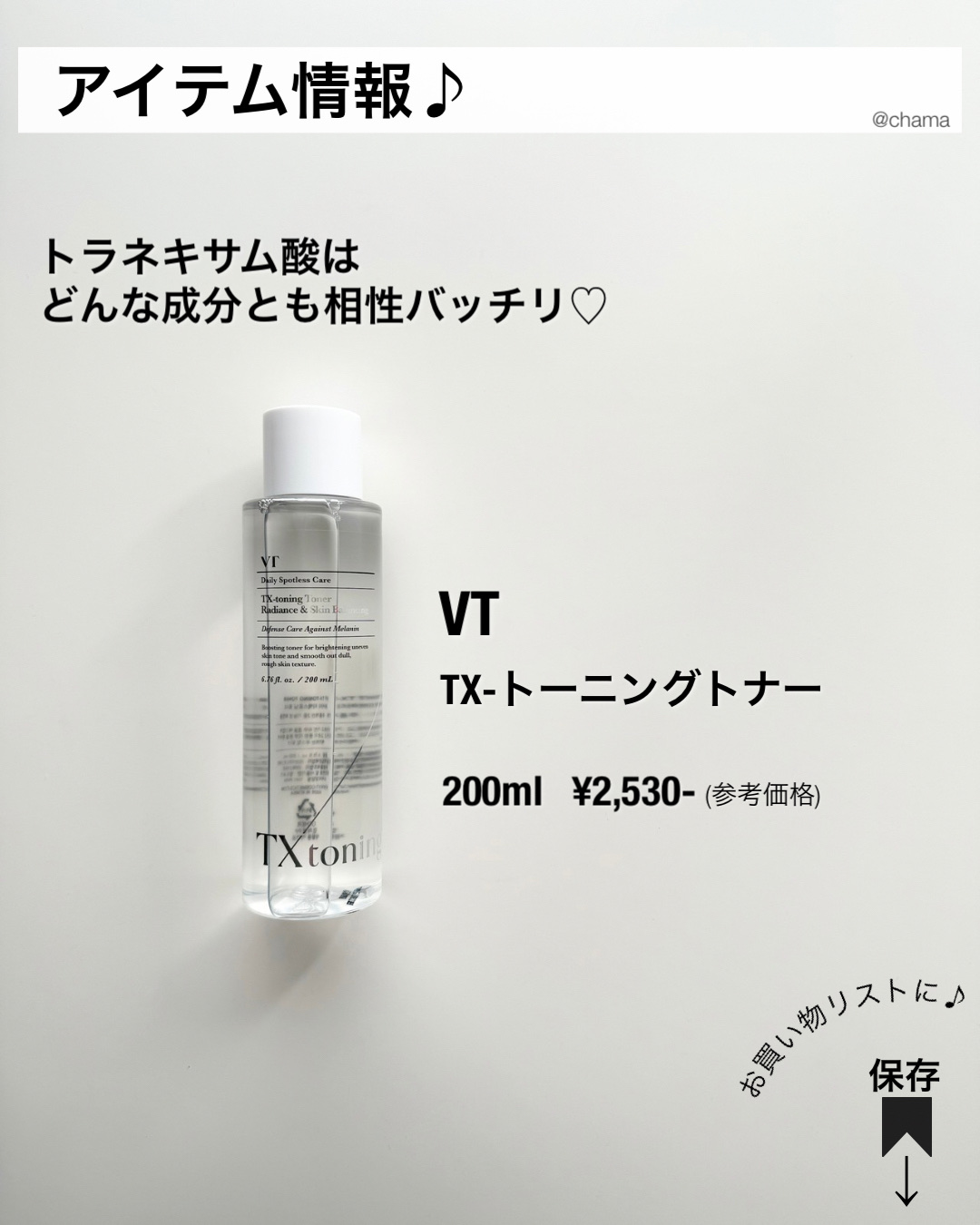 - <TXトーニングトナー> 水、グリセリン、ナイアシンアミド、プロパンジオール、1,2-ヘキサンジオール、トラネキサム酸、エリスリトール、カルボマー、トレハロース、アデノシン、アルギニン、EDTA二ナトリウム、アラントイン、キサンタンガム、グルタチオン、グリチルリチン酸、水添レシチン、マカダミアテルニフォリア種子油、スクワラン、パパイン、マデカソシド、セラミドNP、ツボクサ葉エキス、アジアチコサイド、ステアリン酸、コレステロール、マルトデキストリン