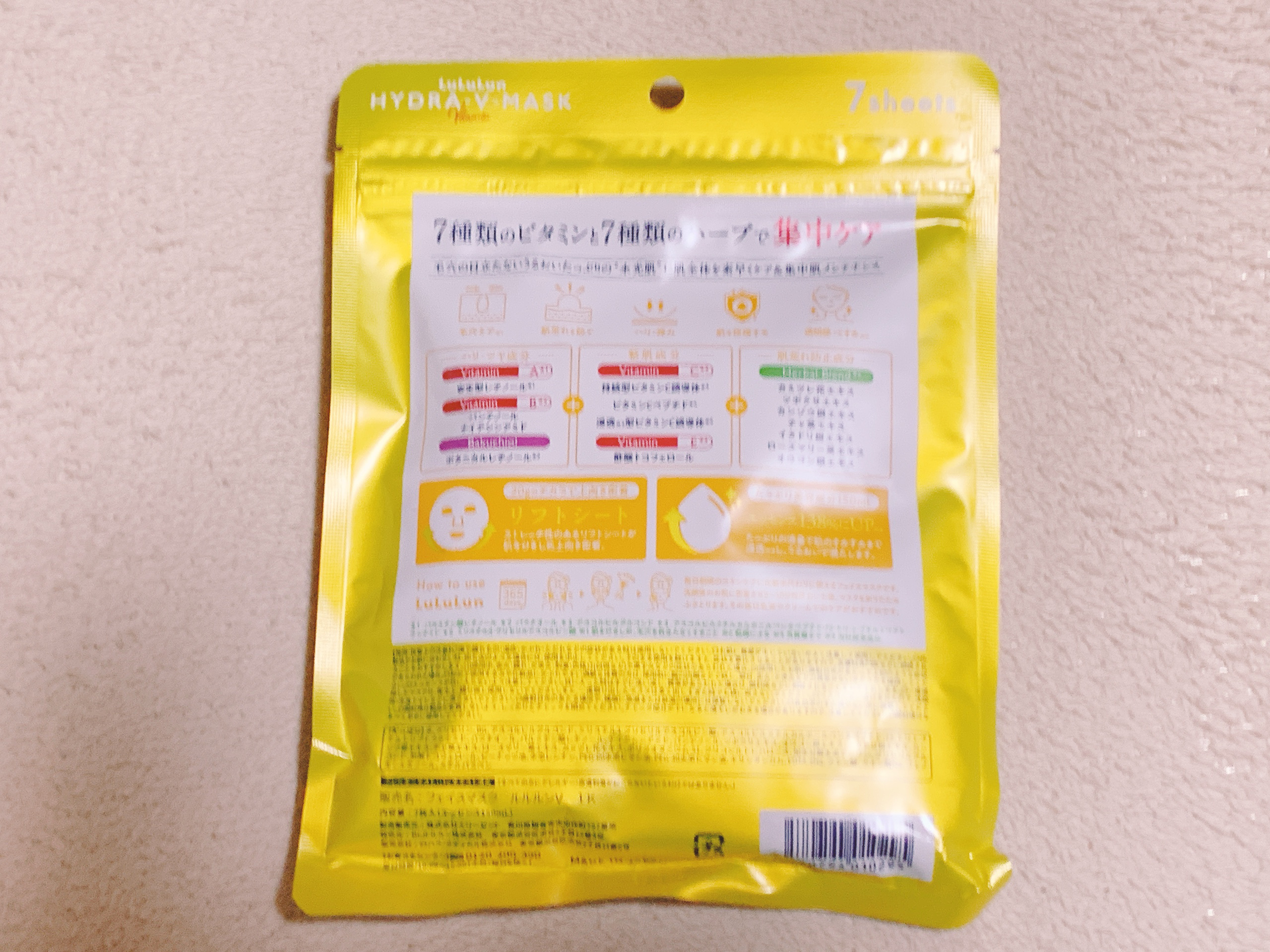 - ルルルンからビタミンたっぷりの化粧水フェイスマスクが新登場。 7種類のビタミン※1と7種類のハーブ※1で肌全体を素早くケア&集中肌メンテナンス。 新開発のフェイスラインに密着するシートで肌を引き締めながら肌のすみずみ※2までうるおいで満たし、毛穴の目立たないうるおいたっぷりの“水光肌”へ。 (※1 全て保湿成分として ※2 角質層まで)