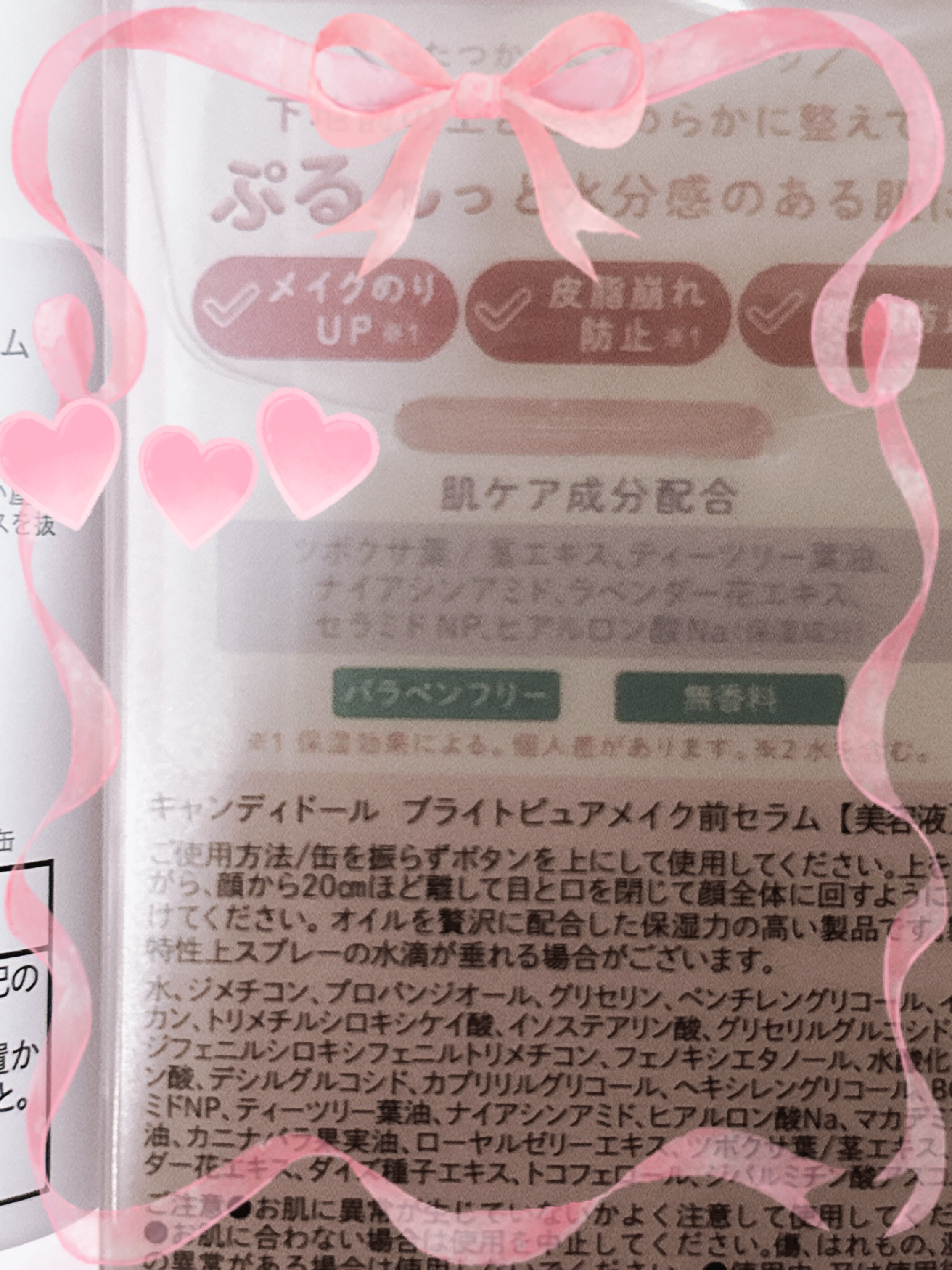 - <キャンディードール ブライトピュアメイク前セラム> 水、ジメチコン、プロパンジオール、グリセリン、ペンチレングリコール、イソドデカン、トリメチルシロキシケイ酸、イソステアリン酸、グリセリルグルコシド、窒素、ジフェニルシロキシフェニルトリメチコン、フェノキシエタノール、水酸化K、クエン酸、デシルグルコシド、カプリリルグリコール、ヘキシレングリコール、BG、セラミドNP、ティーツリー葉油、ナイアシンアミド、ヒアルロン酸Na、マカデミア種子油、カニナバラ果実油、ローヤルゼリーエキス、ツボクサ葉/茎エキス、ラベンダー花エキス、ダイズ種子エキス、トコフェロール、ジパルミチン酸アスコルビル