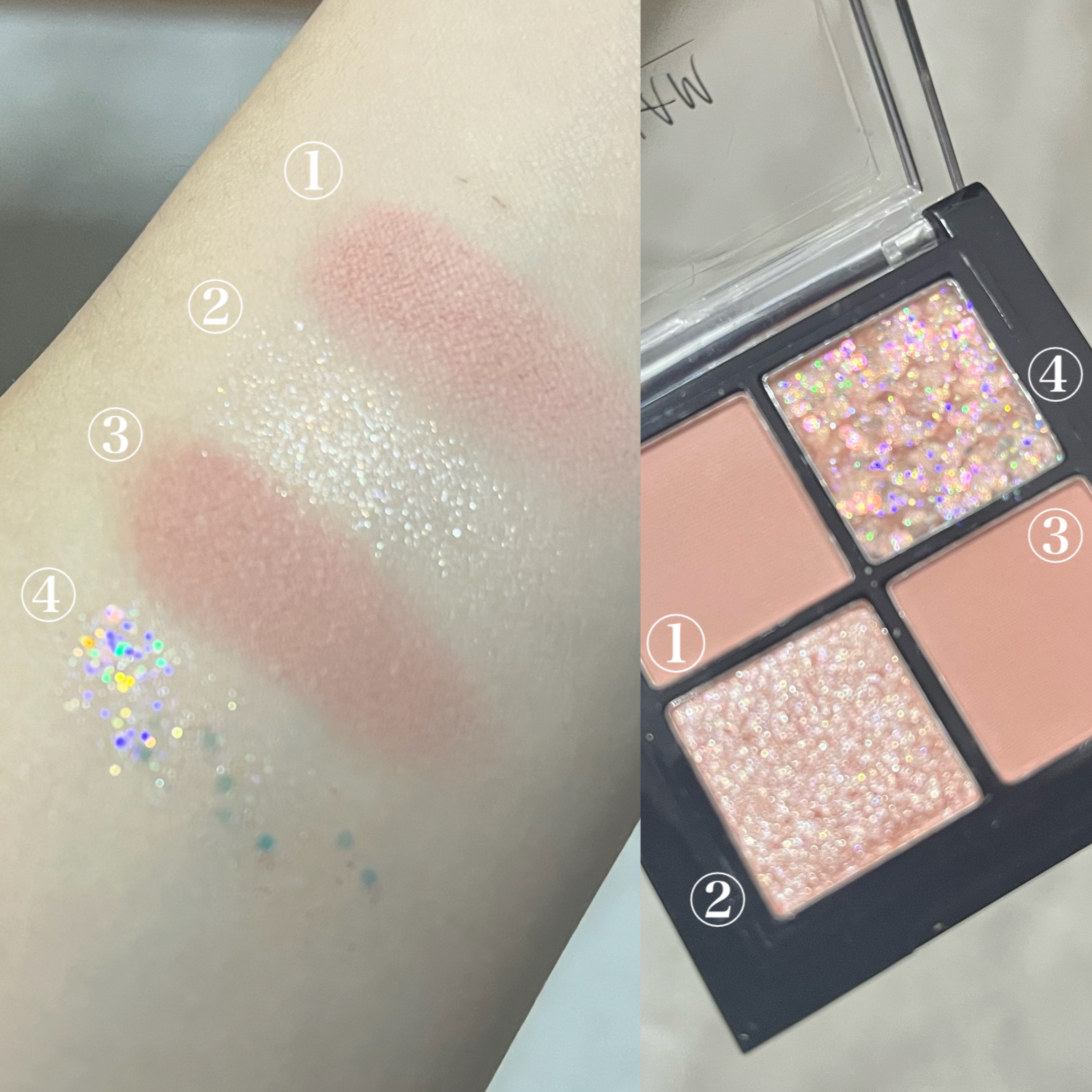 U R GLAMと東京ガールズコレクション(TGC)とのコラボコスメ♡ 2024秋冬の新作、いろんな質感をセットした4色アイシャドウ。 ミルキーなピンクがふんわり発色してかわいい…✨️ イエベの私が使うと、まぶたにはほぼ色が乗らなかったからパールとグリッターでキラキラを楽しむのが良さそう! グリッターはしっとりして密着が良いから粉落ちは気にならなかったよ◎ むしろオフする時にリムーバーシートで先に拭き取りしておくのをオススメします。