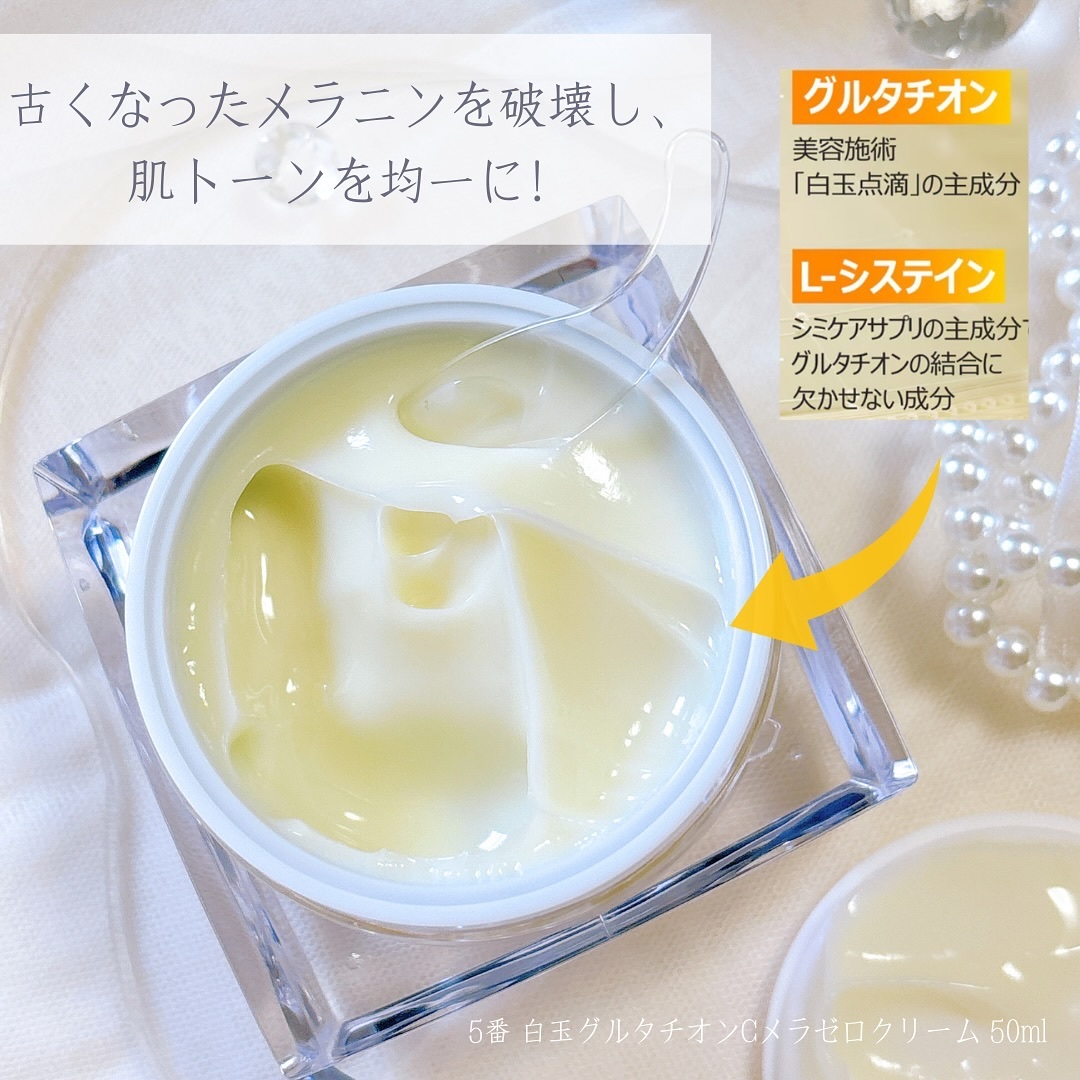 - 大人気『5番白玉グルタチオンCシリーズ』から待望のクリームが登場。 高濃縮グルタチオン*1とビタミン*2配合で、均一で透明感のある肌印象に導くクリーム。 べたつかない程よいしっとり感でお肌にピタッと密着してくれるのでスキンケア最後の段階でお肌にたっぷり塗ると睡眠パックとしてもご活用いただけます。 *1グルタチオン(整肌成分) *2アスコルビン酸、アスコルビルグルコシド、トコフェロール(全て整肌成分)