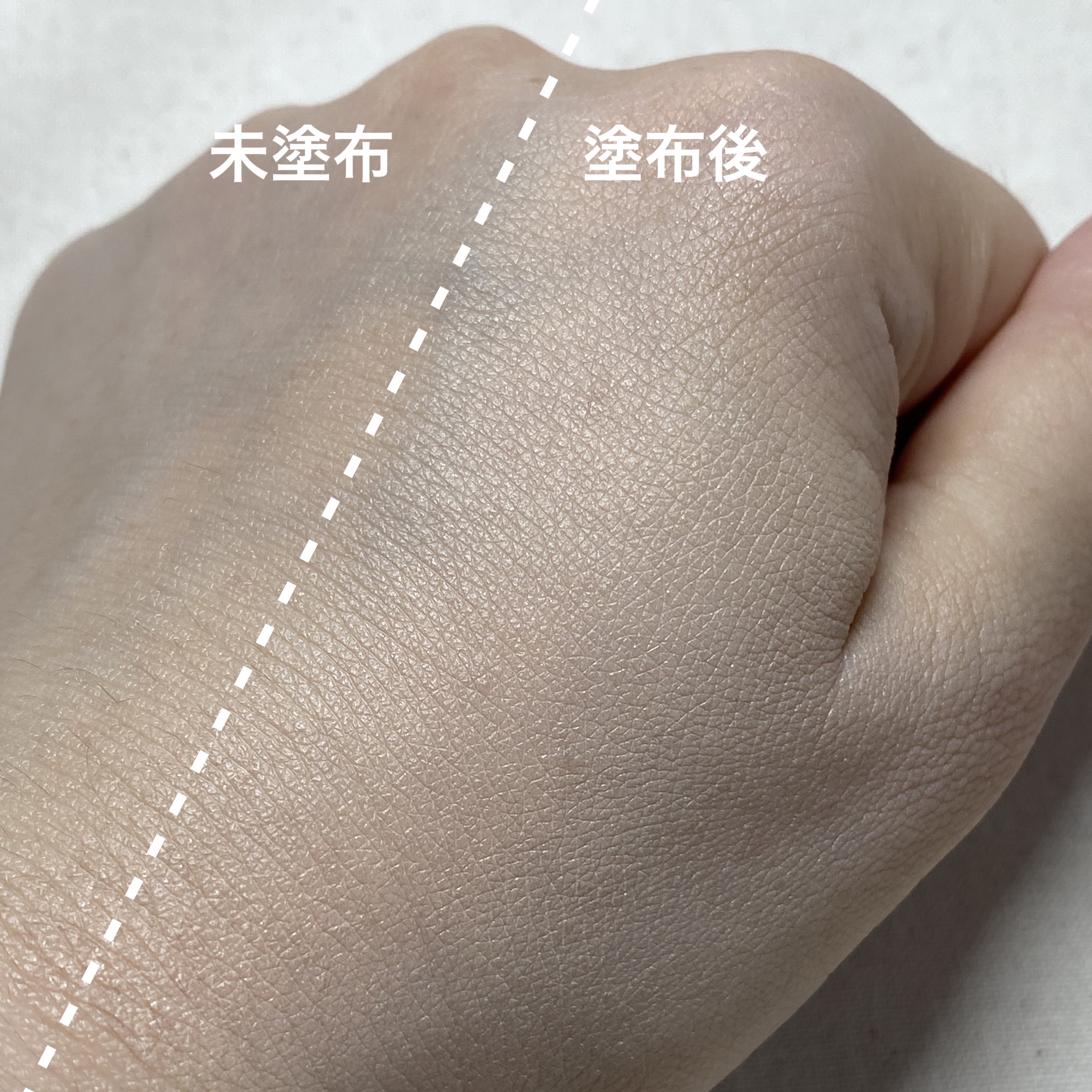 トーンアップするか否かの確認が漏れていて、無色透明のつもりで購入。開封時にパッケージを見てトーンアップやん!?!?となりました。しかしトーンアップと言っても艶で明るく見える程度の仕上がりで好みでした。 無色透明の方がベースメイク前に仕込むのに使いやすく、そのまま首やボディも塗れちゃうので手軽なんですよね。 塗りたては少しべたつくものの、時間が経つとベタつきは感じずしっとりとした触り心地に。