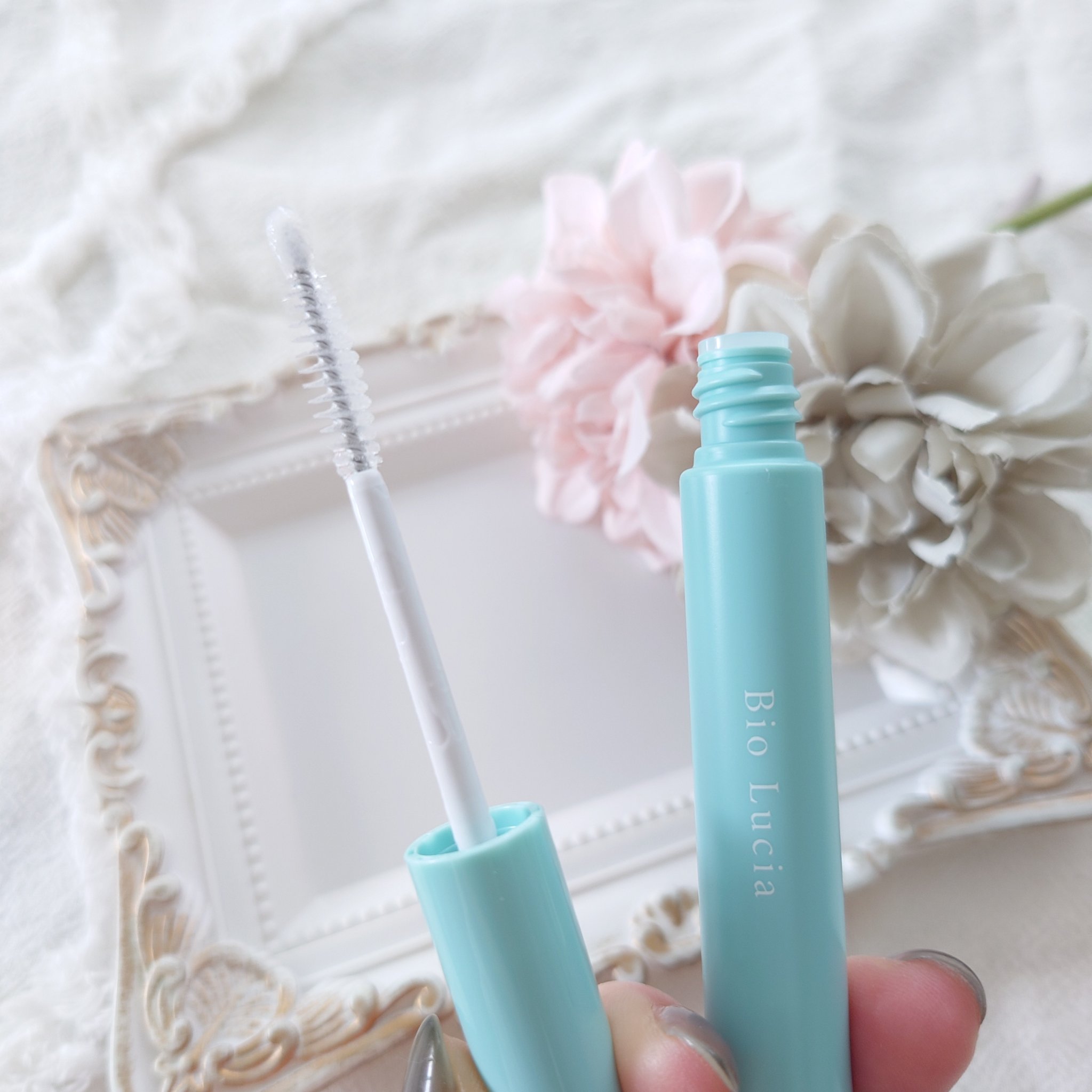 ヒト幹細胞*を含む美容保湿成分 99%配合のまつ毛美容液 まつ毛にハリ・コシを与えてくれるそう。 2WAY形状になっていてまつ毛の根本から毛先の細かい部分まで塗りやすいブラシの先端が丸くなってるから下まつ毛にも塗りやすかった ジェル状の美容液なので細いまつ毛もしっかりキャッチしてくれたよ目に沁みたりせずに使えました🩵