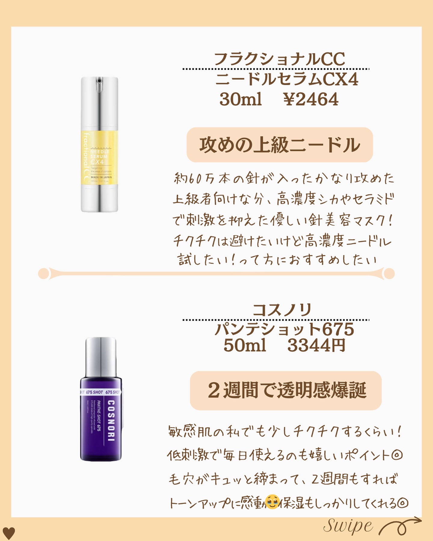 人気美容液『ニードルセラムC』の2本分の約30万本の美容針配合のニードル導入マスクをお試しさせていただきました💝 夜の洗顔後の化粧水前にたったの1分の使用で、美容成分の浸透をサポートしてくれるのは楽チンです🎵 毛穴・くすみが気になる乾燥肌の私にもピッタリ。✨フラクショナルCC ニードルマスクC 6枚入り990円(税込)