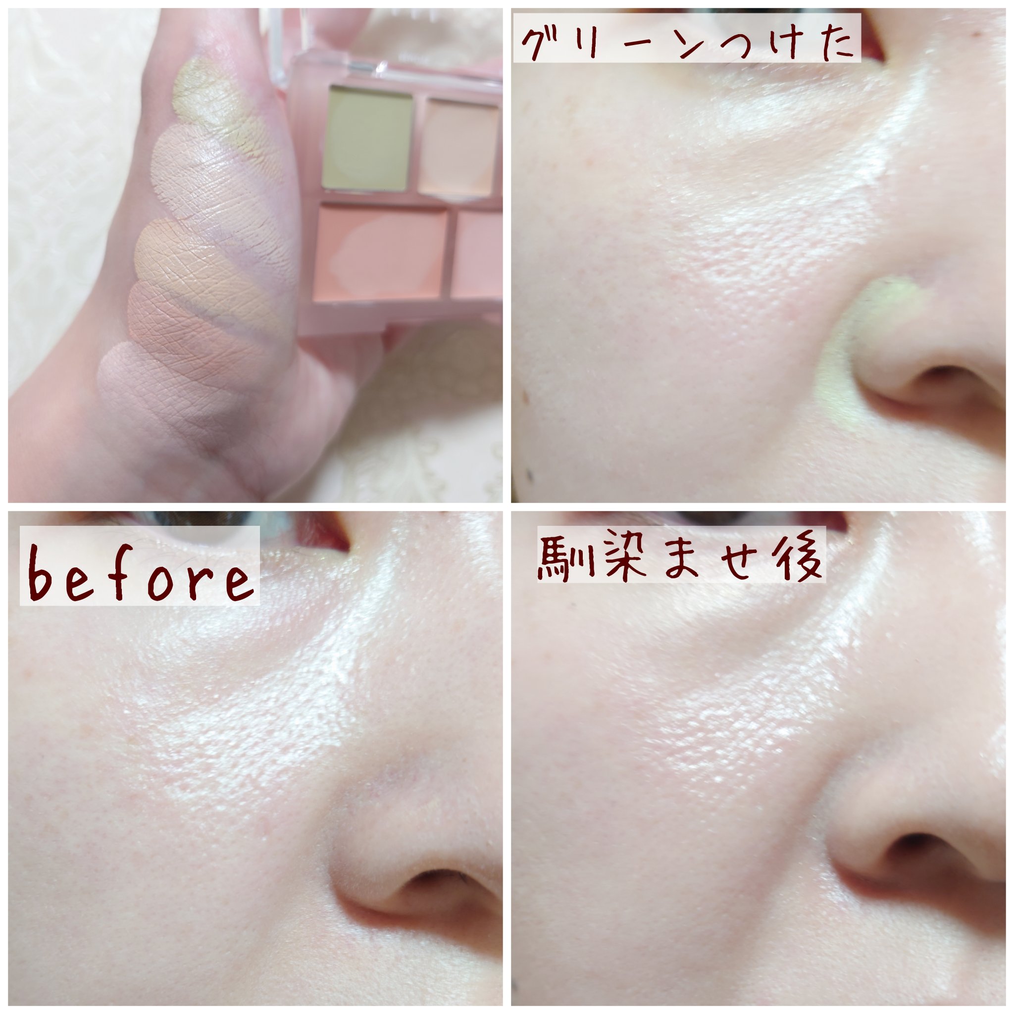 一つのパレットでカバーからカラーコントロールまで色んな肌悩みにアプローチするコンシーラーパレット✨ バームのようなテクスチャーで指で塗ると溶けるように馴染むよ✨ 小鼻の横の赤みにグリーン、口角のくすみにバニラを塗布🙌 目の下のクマにもミディアムピーチの色味がなじみます