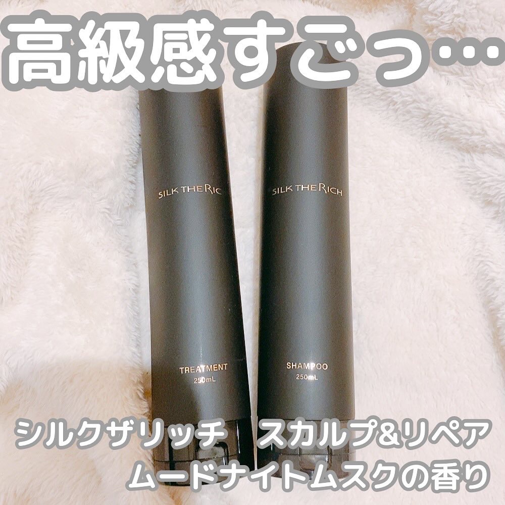 シルクザリッチスカルプ&リペアシャンプー・トリートメントムードナイトムスクの香りシャンプーはとろりとしたテクスチャー。泡立ちが良く、濃密なもっちりとした泡を作ることができます🫧地肌と髪を包み込むように優しく洗えるところが好き♡洗い流しもスムー...