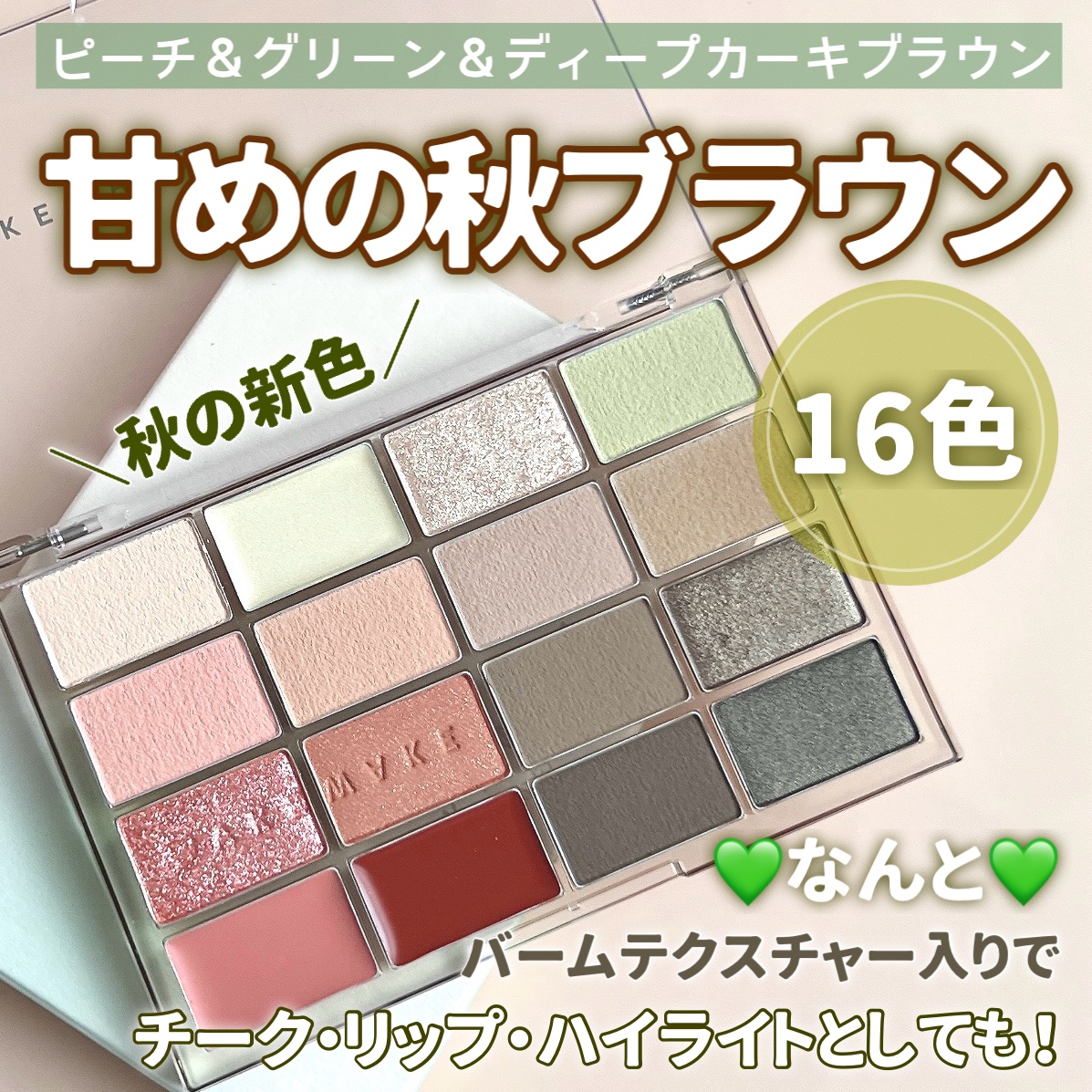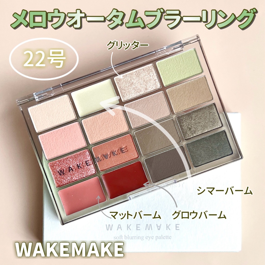 WAKEMAKEのソフトブラーリングアイパレットは、マット・パール・グリッターなど質感の異なる全16色のカラーが入ったアイパレット✨ 22 メロウオータムブラーリングのカラーは、深みのあるカラーにアクセントのあるスモーキーカーキ、暖かみのあるゴールディッシュイエローを感じるディープブラウン&スモーキーメイクルックだそうです🫠🌟 服や気分に合わせて色んなメイクができるのでおすすめです❣️