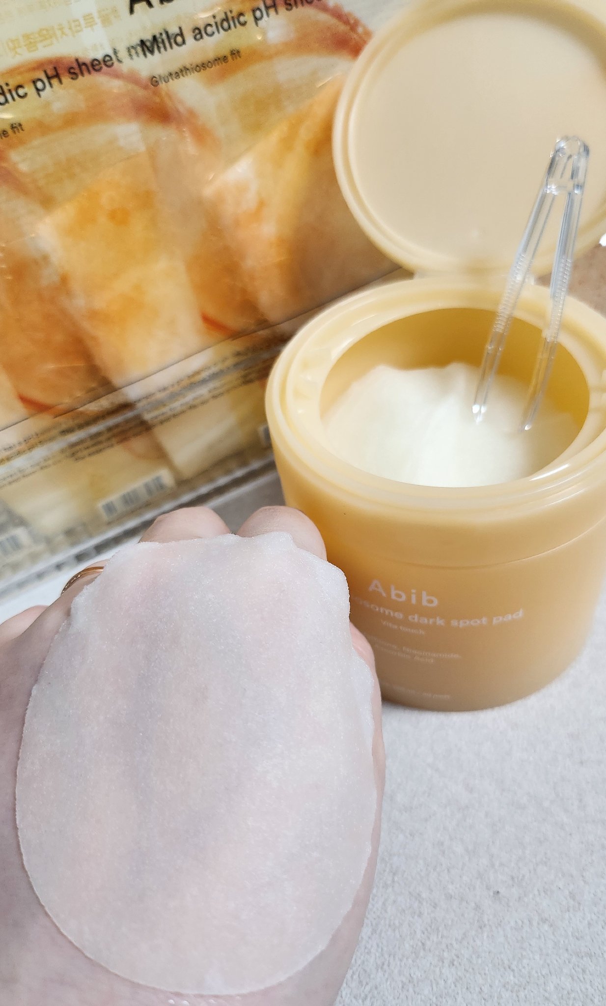 ナイアシンアミド、PlusSome® Vita C、Glutathiosomeの3つの成分でシミやくすみ改善! 塗ると肌の上で弾けるグルタチオンカプセル! ひたひたの美容液と大きめのパッドがうれしい😄 柔らかめで厚いパッドがピタッとくっつき部分ケアにとてもいいなと思いました! Abibの美白ラインは 夏の紫外線が気になる方、くすみシミを改善したい方に特におすすめです👍👍