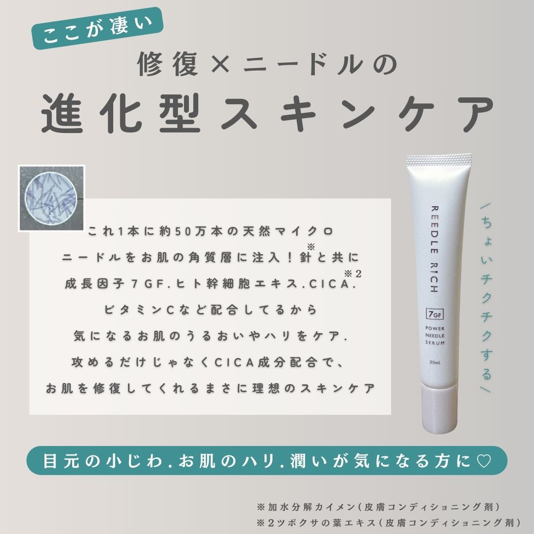 - 瞬間1秒 針美容で集中ケア。独自製法で作られた高純度99.9%の天然マイクロニードルを1本あたり500,000本配合したリッチセラムです。皮膚科学の技術を活用した成長因子7GF*1やヒト幹細胞エキス*1、CICA*2、ビタミンC*1も贅沢配合しています。肌に配慮した処方。日本製造。 *1整肌成分 *2ツボクサ葉エキス(整肌成分)