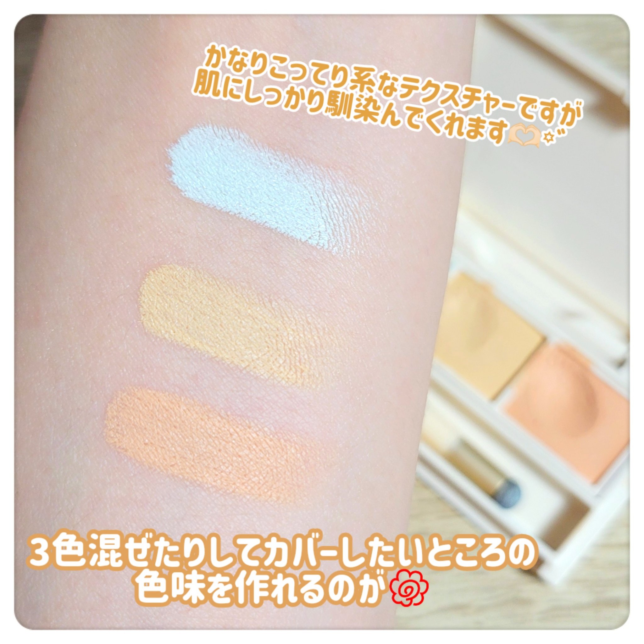 人気のWEB限定アイテムが遂にドン・キホーテ限定で発売開始🫶 使用感は少しやわらかめのテクスチャでしっとりしています! 完璧なカバー力を求める方には物足りないかもしれませんが、ある程度肌悩みはファンデーションなどで隠すという方や元々肌が綺麗な方は十分かなと思います! 三色入っているので肌悩みに合わせてブレンドして使うことも出来ますし、ミントカラーを混ぜて他のカラーのトーンを明るくすることも出来るので使いやすいです◎