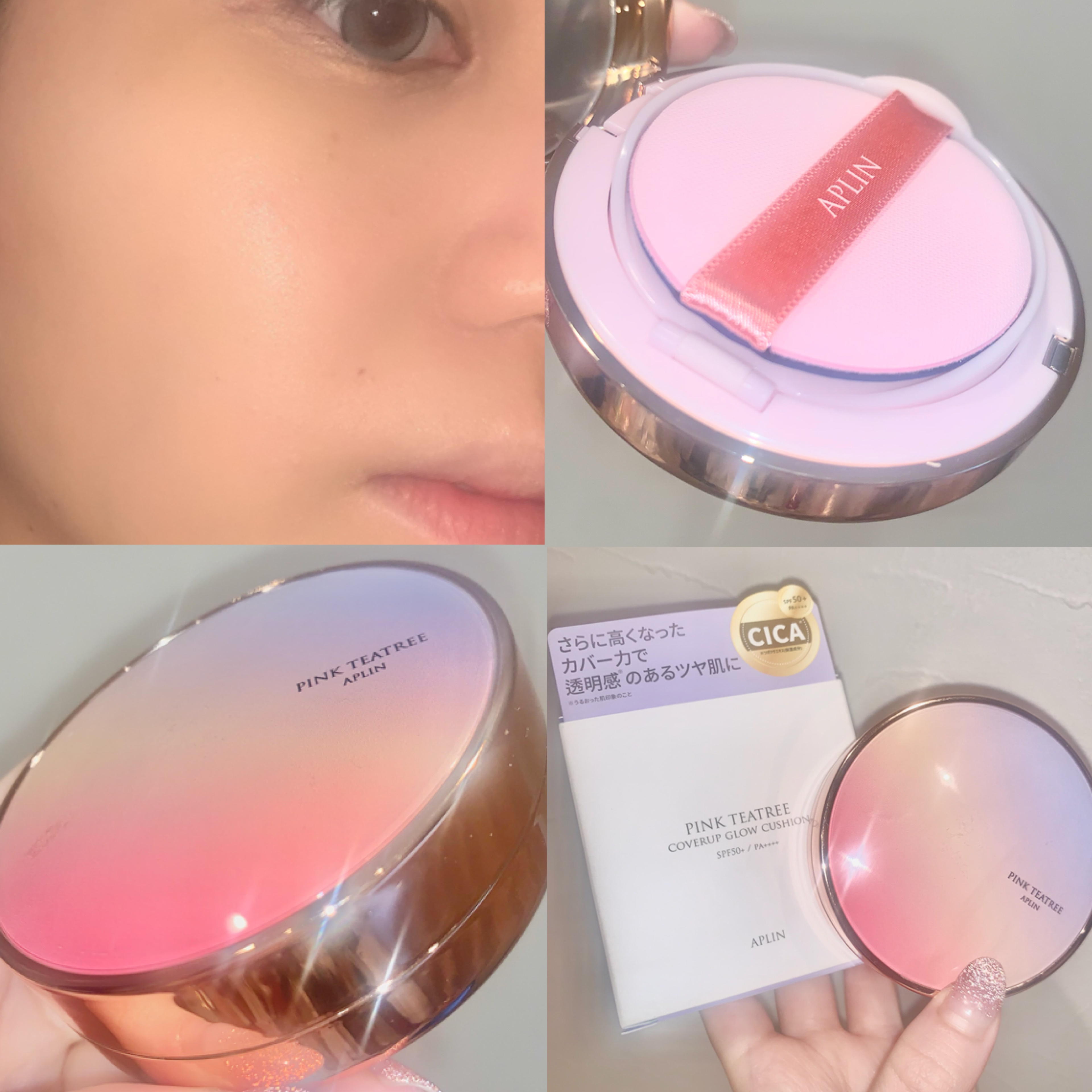 混合肌や敏感肌におすすめのピンクティーツリーカバープライマークッション カラーは『21号』を使用しました! SPF50+ PA++++の高UVカットのクッションファンデーション うるおい感がありながら、ピタッと肌に密着してくれるテクスチャ