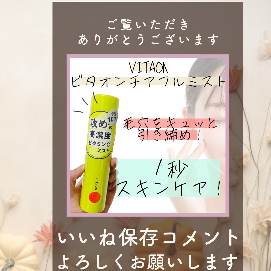 VITAON/ビタオンチアフルミストお風呂上がりに気軽にシュッと出来て、柑橘の香りが心地いいです🍋細かいミストですが、振りかけると膜?に覆われるというか肌はサラサラではないです。ベタベタまでいかないですが、高濃度ビタミンだから…?ピリピリとか...