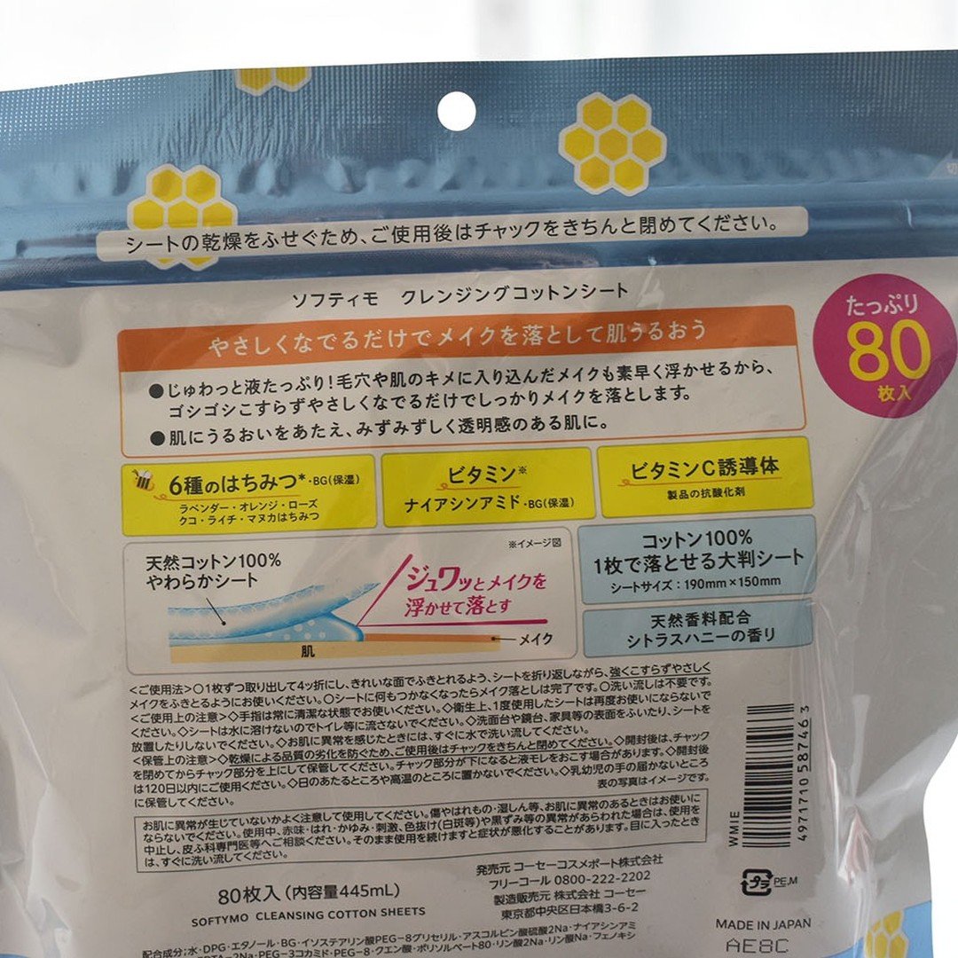 やさしくなでるだけでメイクをしっかり落とす、オールインワンクレンジングシートです。メイク落とし、洗顔、化粧水、保湿、角質ケア、透明感ケアの6役のクレンジングコットンシート。 1枚でしっかり落とせる大判タイプで、たっぷり使える大容量80枚入なのもうれしいです。 やや薄めのシートで、やわらかい肌触りです。シトラスハニーの甘く爽やかな香り。