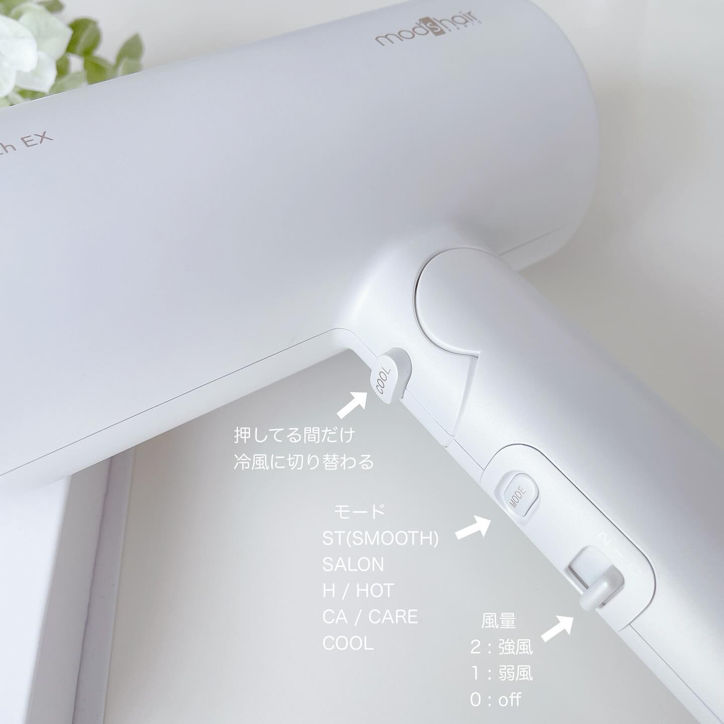 - スムーズEXフィルターで、 上質でなめらかな触り心地。髪の美しさを整える「モッズ・ヘアドライヤー スムーズEX」 せっかく染めてもなかなかキープできないヘアカラー。 髪の水分バランスを整えるマイナス電子、オーバードライを防ぐ低温ドライの効果で、お気に入りの髪色をキープしやすく。 【もっとツヤめく髪へ】 サロン帰りのようなツヤが簡単に。 短めの低温風(約58℃)と長めの冷風が交互に自動で切り替わるサロンモード(温冷自動切替モード)で髪の表面のキューティクルを整え、ツヤのある指通りのいい髪へ。 【その他の便利な機能】 ・選べる5つのモード 5つのモードを搭載、髪への負担を少なく乾かしたい、素早く乾かしたい、仕上げをよくしたい、地肌もケアしたい、5つのモードで選べる使い方が可能に。(スムーズ/サロン/ホット/ケア/クール) ・電源スイッチ 0: OFF / 1: 弱風 / 2: 強風 ・クールスイッチ 直感的に使えて、使いやすい ・お手入れ簡単フィルター お手入れしやすいメッシュフィルター採用 ・丈夫なゴムコード ・折りたたみ・軽量モデル 折りたたみモデルだから、収納も簡単
