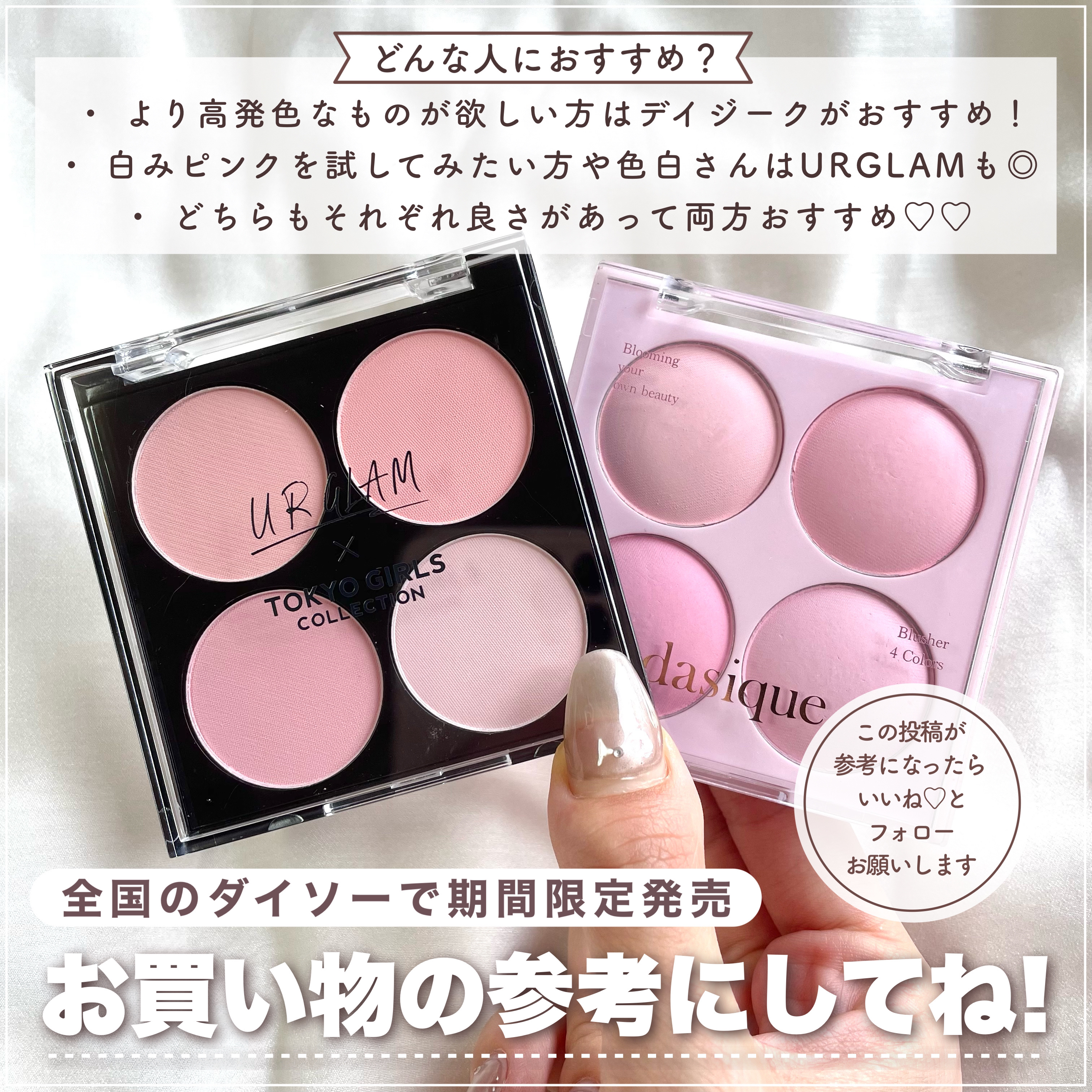 ダイソーで買えるプチプラコスメ「U R GLAM」とTGCのコラボコスメ♡ 色なじみがよくて、悪目立ちしないのは良いのかな🙆 とはいえ、330円でこの使用感はすごい! ふんわり発色が使いたい人に合いそう♡