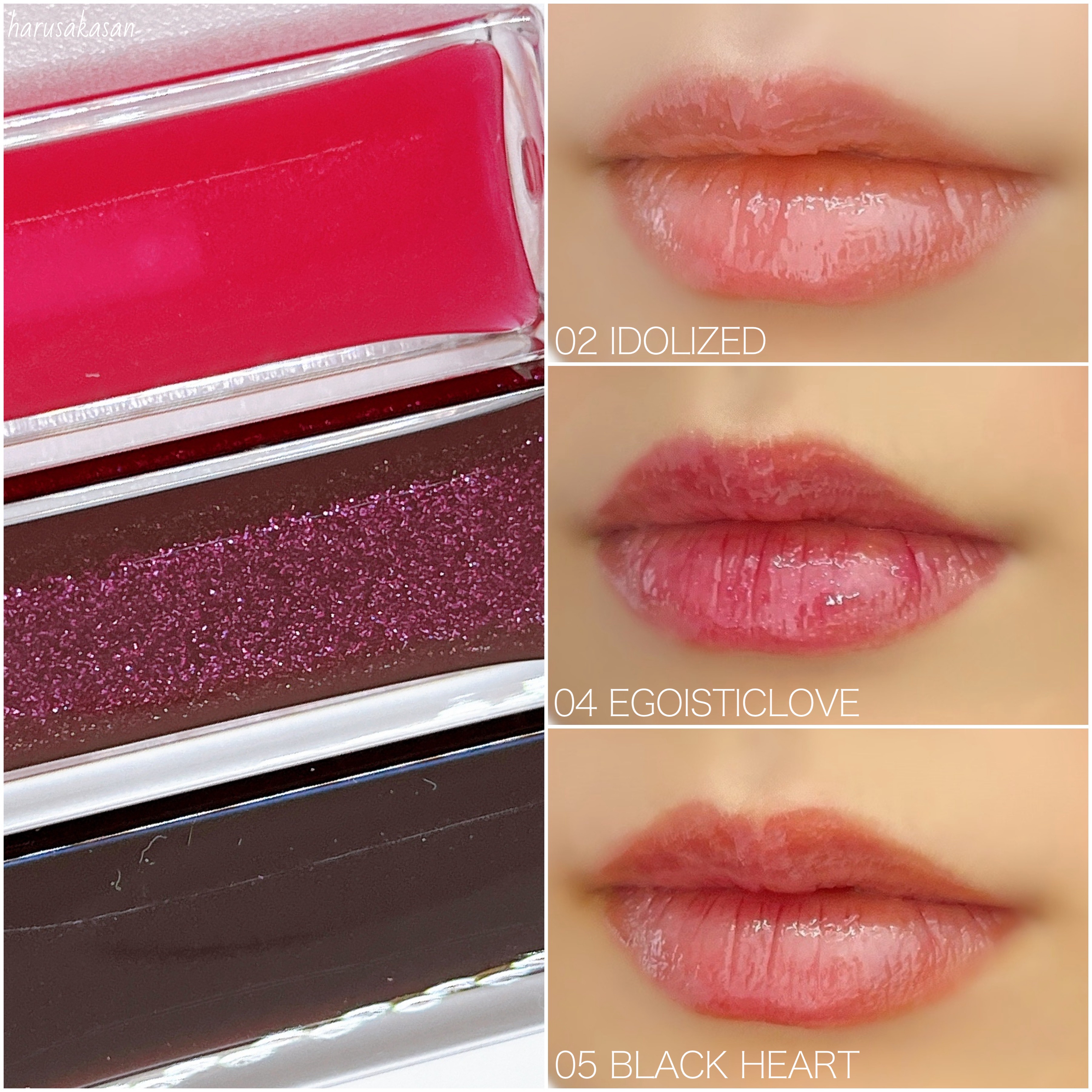 蜜みたいにとろけるうるおいリップオイル🍯✨ 唇に血色感与え、透明感ある発色。 保湿成分のサフラワー油配合で、紫外線やエアコンの影響で乾燥しがちな唇もうるおってぷるんとした仕上がりに。 全6色から私がお試ししたのはブルベさん向けの青み系3色!