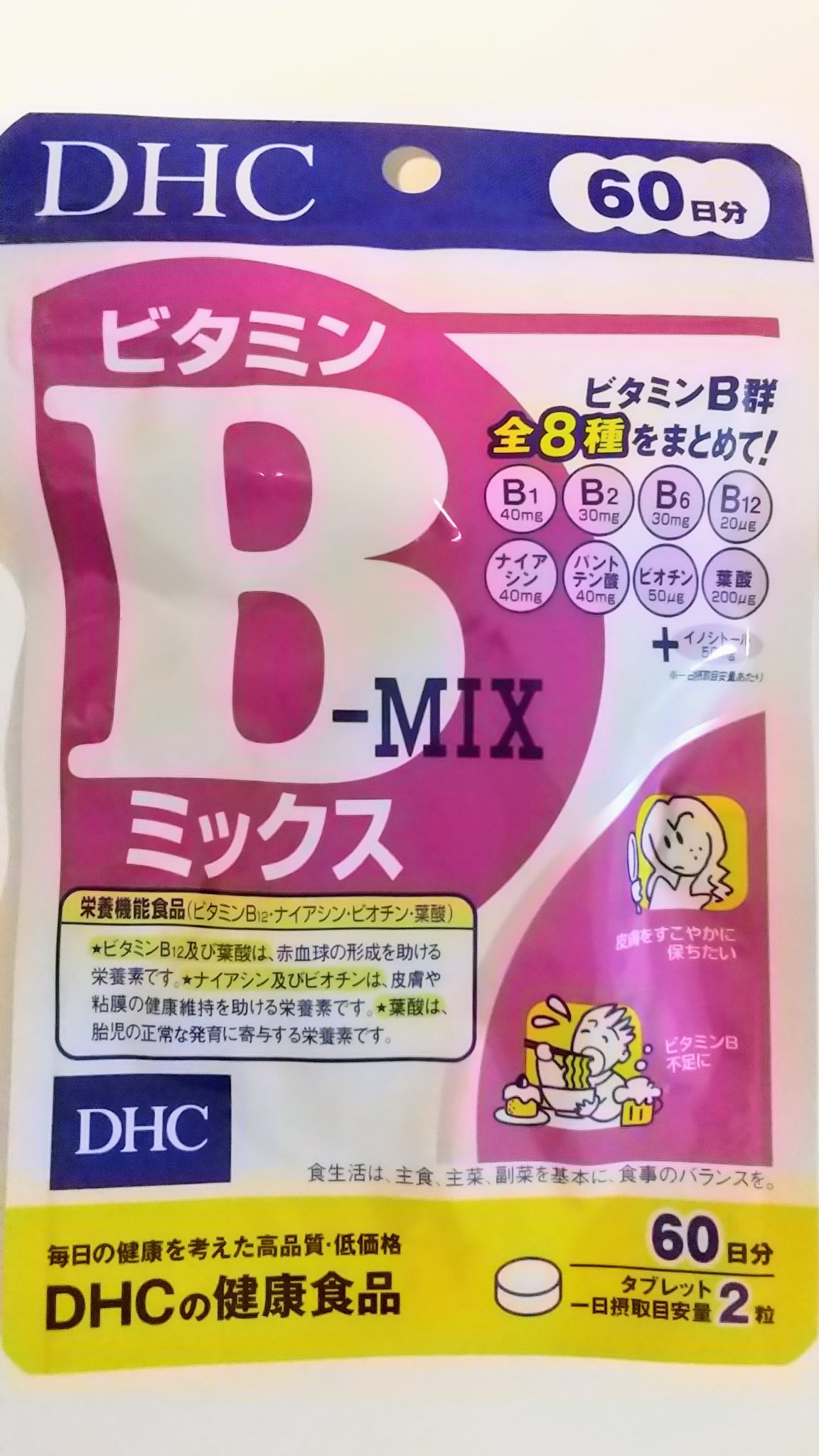 - ビタミンB群は、糖分やたんぱく質などの栄養素をエネルギーにかえる必須ビタミン。 美容やスタミナ、ダイエット中の栄養補給などに欠かせないビタミンB1、B2、B6、B12、ナイアシン、パントテン酸、ビオチン、葉酸のビタミンB群全8種類にイノシトールを、バランスよく配合しました。 栄養機能表示 ●ビタミンB12及び葉酸は、赤血球の形成を助ける栄養素です。 ●ナイアシン及びビオチンは、皮膚や粘膜の健康維持を助ける栄養素です。 ●葉酸は、胎児の正常な発育に寄与する栄養素です。 ※葉酸は、胎児の正常な発育に寄与する栄養素ですが、多量摂取により胎児の発育が良くなるものではありません。 ※水またはぬるま湯で噛まずにそのままお召し上がりください。 ※本品は、多量摂取により疾病が治癒したり、より健康が増進するものではありません。一日の摂取目安量を守ってください。 ※本品は、特定保健用食品と異なり、消費者庁長官による個別審査を受けたものではありません。 ※原料の性質上、斑点が生じたり、色調に若干差が見られる場合がありますが、品質に問題はありません。 【名称】 ビタミンB群含有食品 【原材料名】 澱粉(国内製造)/セルロース、イノシトール、パントテン酸Ca、ビタミンB1、ナイアシン、ビタミンB6、ビタミンB2、微粒二酸化ケイ素、ステアリン酸Ca、セラック、葉酸、ビオチン、ビタミンB12 【飲み方】 一日の摂取目安量2粒 【栄養成分表示[2粒400mgあたり]】 熱量1.6kcal、たんぱく質0.15g、脂質0.01g、炭水化物0.22g、食塩相当量0.0004g、ビタミンB1 40.0mg、ビタミンB2 30.0mg、ビタミンB6 30.0mg、ビタミンB12 20.0μg(833)、ナイアシン40mg(308)、パントテン酸40.0mg、ビオチン50μg(100)、葉酸200μg(83)、イノシトール50mg ※上記( )内の値は、栄養素等表示基準値(18歳以上、基準熱量2200kcal)に占める割合[%]です。 ※一日の目安量を守って、お召し上がりください。 ※お身体に異常を感じた場合は、摂取を中止してください。 ※特定原材料及びそれに準ずるアレルギー物質を対象範囲として表示しています。原材料をご確認の上、食物アレルギーのある方はお召し上がりにならないでください。 ※薬を服用中あるいは通院中の方、妊娠中の方は、お医者様にご相談の上お召し上がりください。 ●直射日光、高温多湿な場所をさけて保存してください。 ●お子様の手の届かないところで保管してください。 ●開封後はしっかり開封口を閉め、なるべく早くお召し上がりください。 食生活は、主食、主菜、副菜を基本に、食事のバランスを。