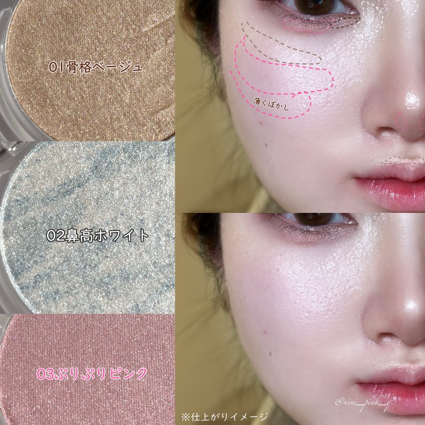 - b idolから新定番! 私にかける、魔法の光。 叶えるハイライト \立体感*血色*透明感/ 欲しいところにプラスする、シルキータッチなハイライト 骨格ベージュで顔全体をフラットになじませて、 鼻高ホワイトで鼻筋や額、高く見せたい所にポイント使い♪ ぷりぷりピンクはチーク使いでかわいく仕込む♡ お肌のことを考えた美容成分*配合なので使いやすい◎ マルチに使える3色展開!コンパクトなのでもち運びにもとっても便利。 *ティーツリー葉油、ヒアルロン酸Na、セラミドNP(全て保湿成分) <01 骨格ベージュ> 自然に溶け込む立体ベージュ <02 鼻高ホワイト> 透明感をひきあげるポイントマーブル <03 ぷりぷりピンク> やわらかな丸みを仕込む血色ピンク ※全てメイクアップ効果