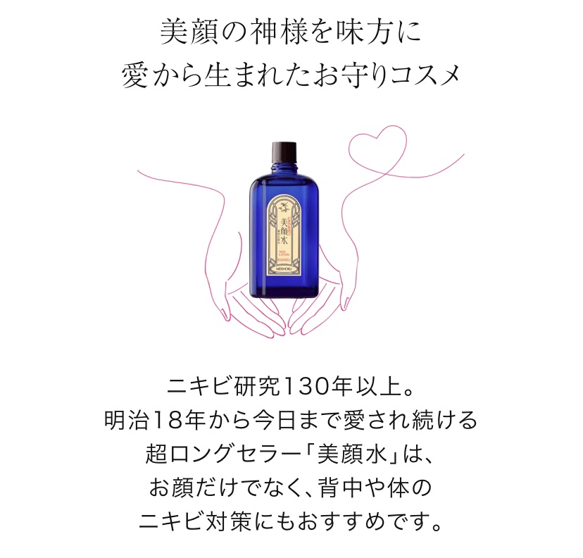 - ※2024年3月〜パッケージ・価格をリニューアル。尚これにかかる商品の返品・交換は承っておりません。 【医薬部外品】 ■«ニキビ肌に医薬部外品処方»毛穴につまった古い角質や黒ずみ等の汚れをやさしい使い心地で除去する「サリチル酸」と、アクネ菌を殺菌する「ホモスルファミン」を配合。殺菌・消炎成分配合の薬用処方で、ニキビの原因にしっかりアプローチ。ニキビを防ぎます。 ■«毛穴ケアにも»サリチル酸配合で古い角質による毛穴のつまりや角栓をやさしい使い心地で拭きとり、毛穴の黒ずみ汚れを簡単ケア。肌を引き締め、過剰な皮脂を抑えてテカリを防止します。清潔な肌を保ちます。 ■<130余年の超ロングセラー>明治18年に誕生した明色美顔水は、大人から子供まで、ニキビに悩む全ての方々に愛され続けています。